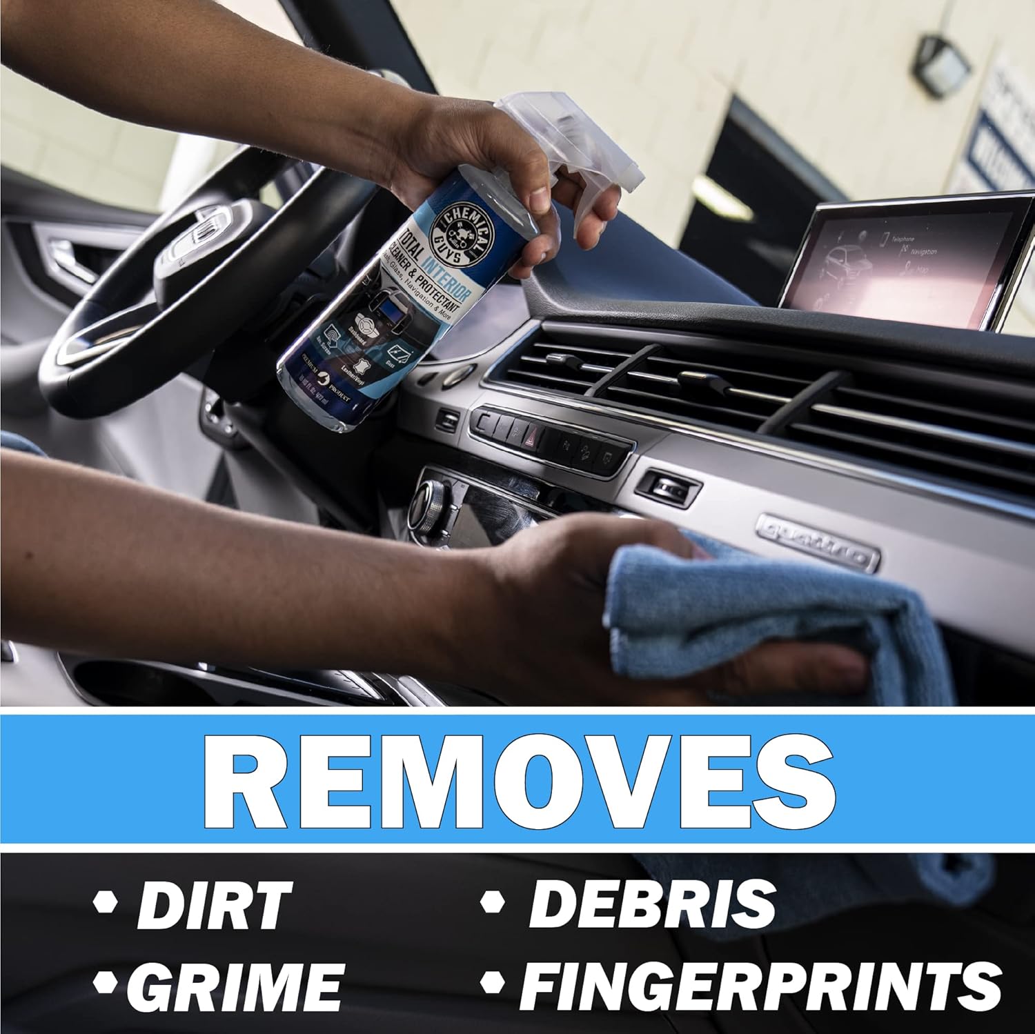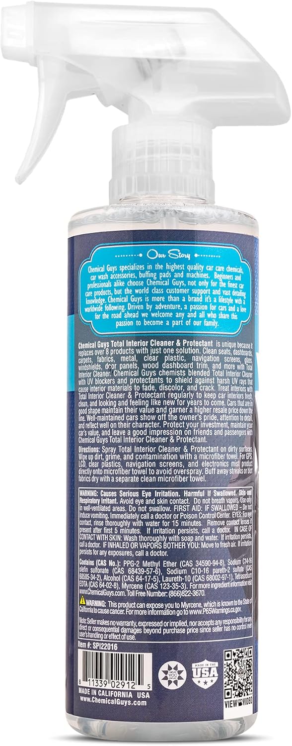 ONE CLEANER TO RULE THEM ALL – Rather than use separate cleaners for leather, vinyl, plastic, carpet, cloth, glass, and wood, Chemical Guys developed Total Interior Cleaner & Protectant; with just one product, you can now clean and protect virtually all interior surfaces!
