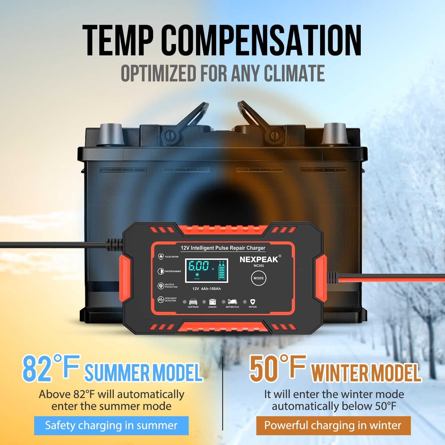 NEXPEAK NC101 Car Battery Charger, Smart Battery Trickle Charger 12V 6A Automotive Battery Maintainer Desulfator with Temp Compensation for Car Truck Motorcycle Lawn Mower Marine Lead Acid Batteries