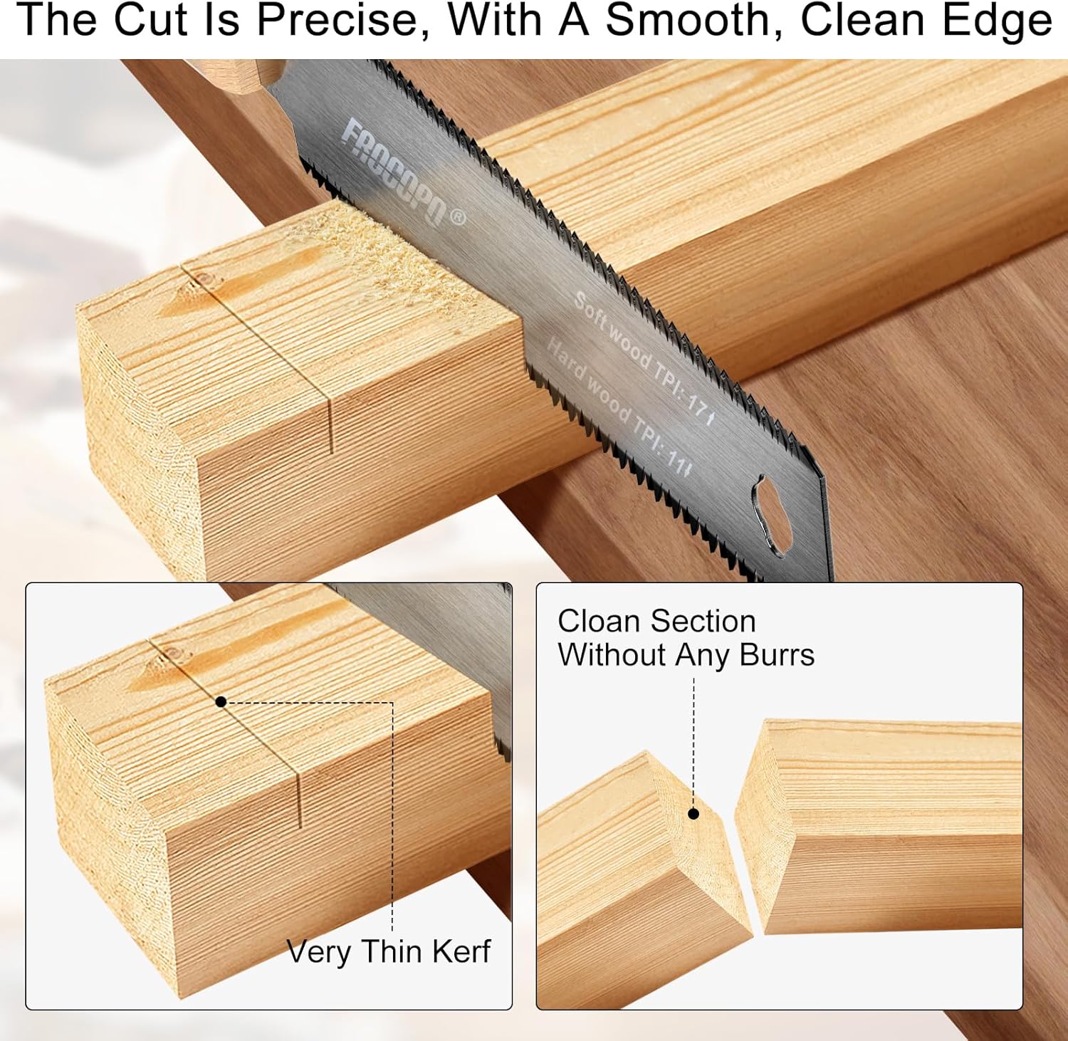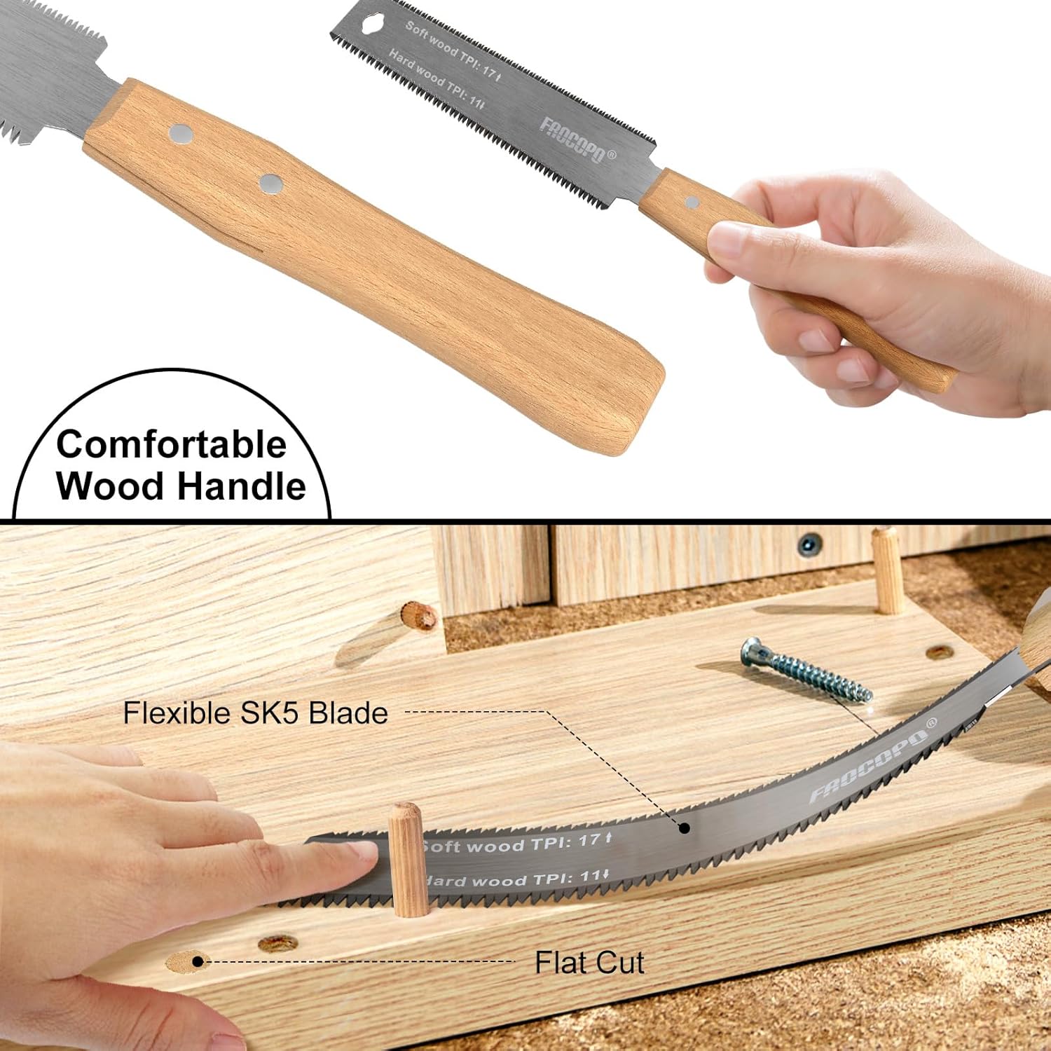 Double Edged: Frocopo 6-inch flexible double edge hand saw features a unique double-sided blade: 11 tpi coarse teeth on one side for quick cuts and 17 tpi fine teeth on the other side for smoother finishes. Hand saw ideal for a variety of cutting tasks