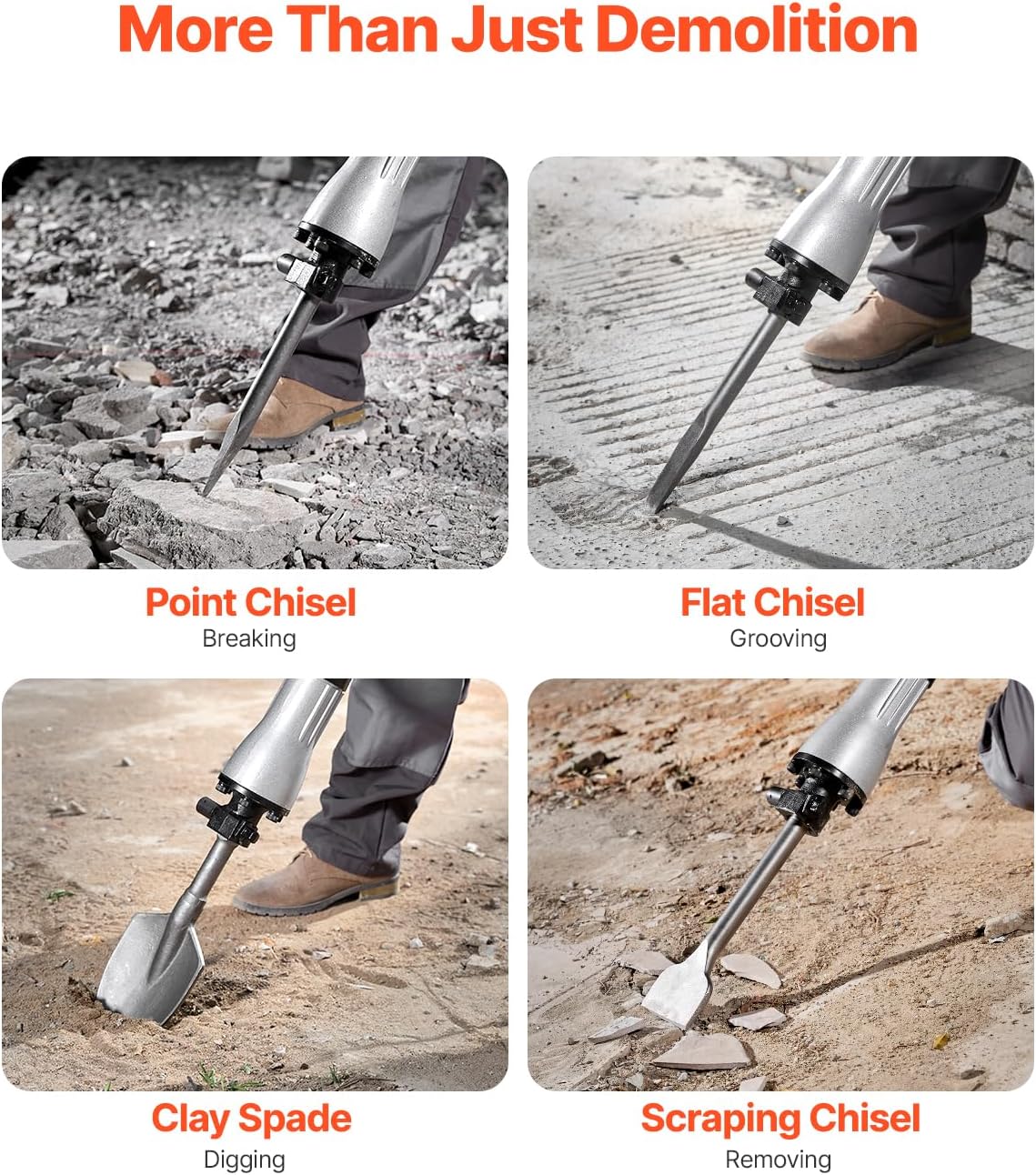 Replacement Chisels Included- 4 chisels bits:clay spade chisel, scraping chisel, flat chisel, point chisel, It is made from heat-treated alloy steel. Other Accessories Pair of protective gloves, case, hex wrenches.