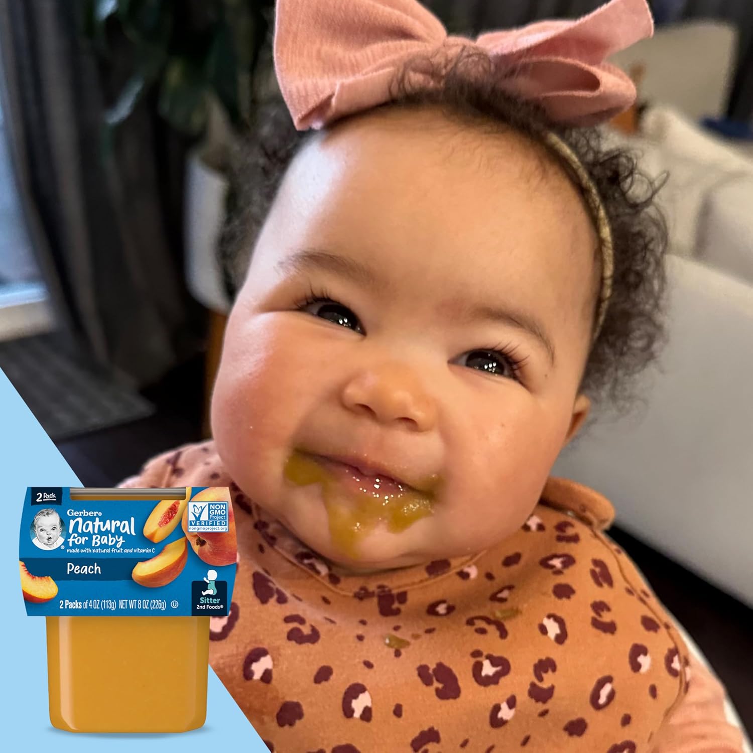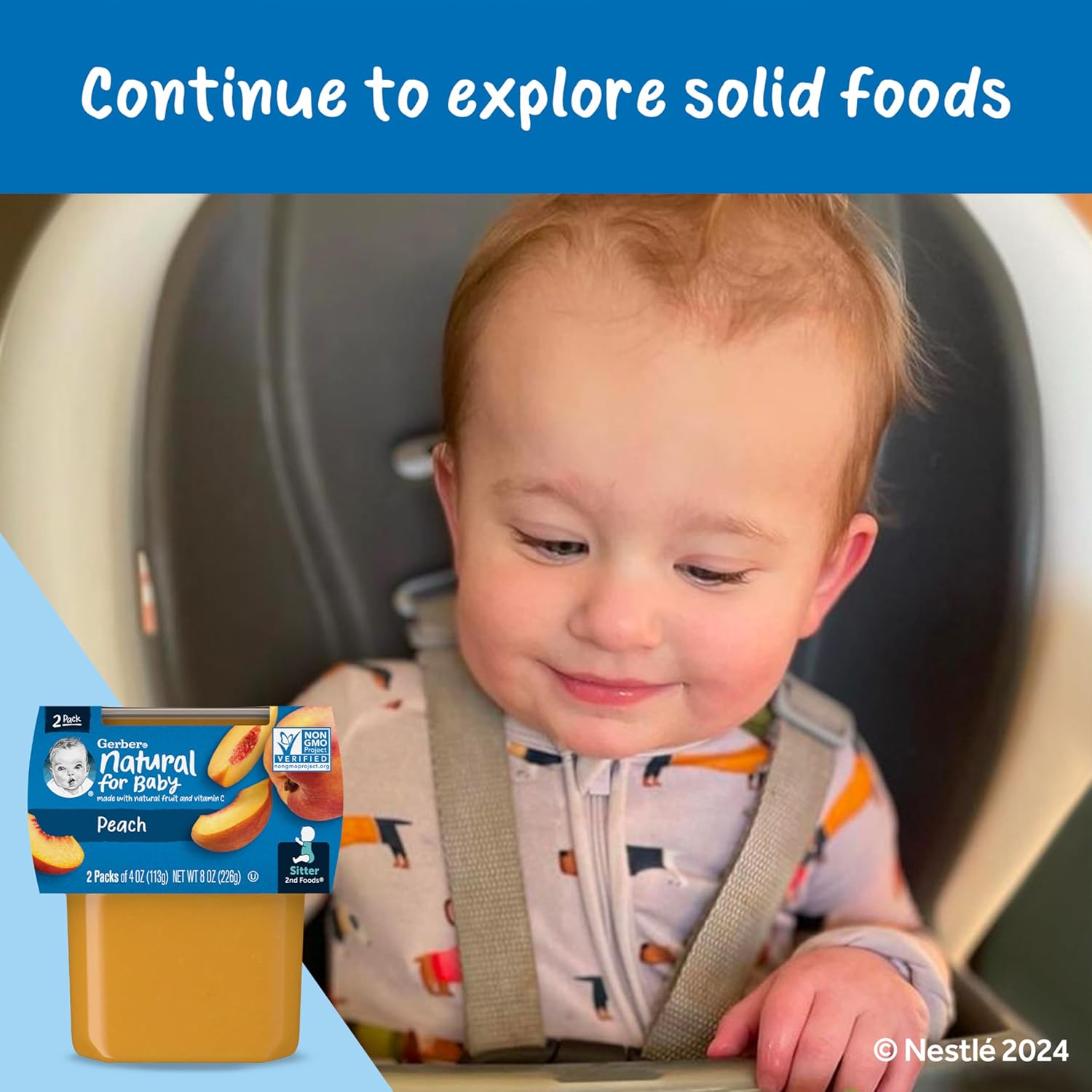 Gerber 2nd Foods Peach Baby Food makes feeding time delicious and easy while encouraging your baby’s love of fruit. Made with natural fruit that meets Gerber’s high quality standards, this Gerber peach puree contains peaches grown using Clean Field Farming practices for a delicious single-fruit baby food. This non-GMO baby food stage 2 recipe includes 3/4 peach in each tub and is unsweetened with no artificial colors or flavors and no added starch. Help meet your baby’s nutritional needs with this Gerber fruit puree, which gives your child 45% daily value of antioxidant vitamin C in each tub. Gerber 2nd Foods help expose babies to a variety of tastes and ingredient combinations, which is essential to help them accept new flavors. Tuck these convenient BPA-free tubs into your diaper bag so you can easily feed your sitter on the go. You can feed your little one straight from the container, or add some to a bowl and refrigerate the leftovers for up to two days.