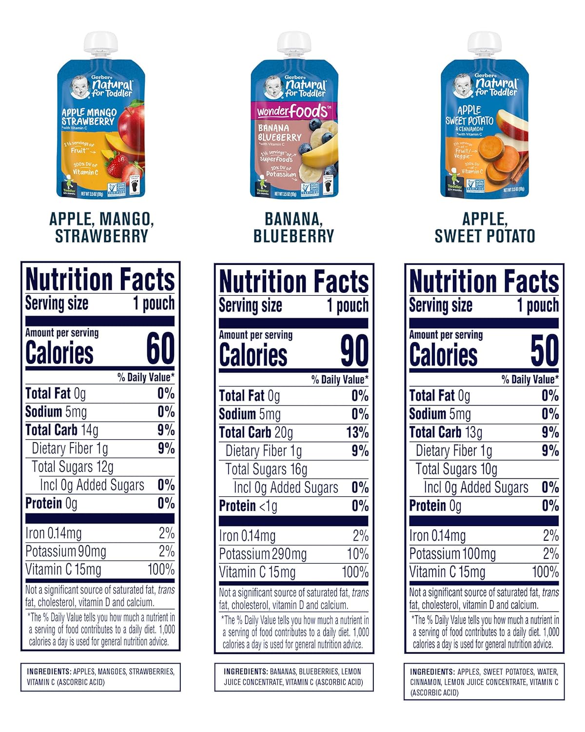 Variety pack: This pack of 18 pouches includes 6 each of the following: Banana & blueberry; Apple, mango & strawberry; Apple & sweet potato with cinnamon. No artificial flavors or sweeteners