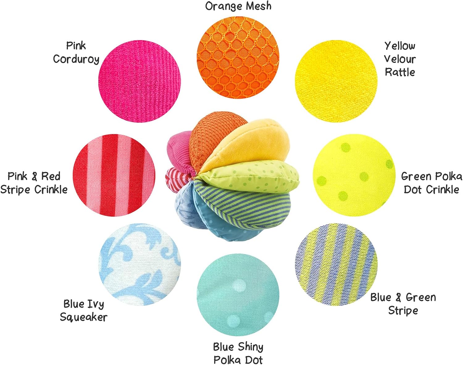 GRASPING AND GROSS MOTOR SKILLS: This durable 6″ fabric ball is lightweight and easy to grasp. The size and shape are perfect sensory toys for babies for encouraging reaching, grabbing & rolling.