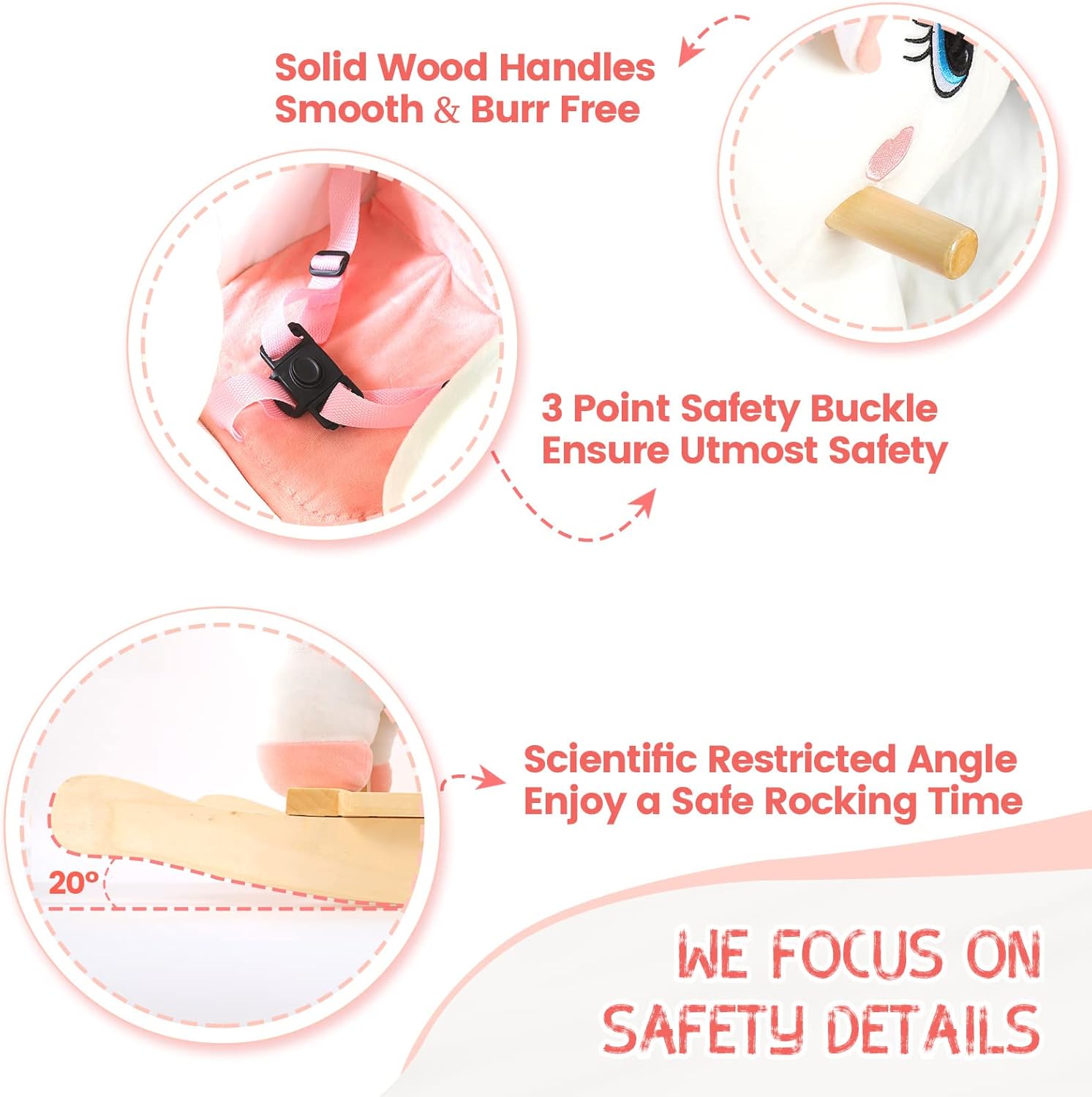 【We Focus on Every Safety Detail】Safety first when children play. Funlio rocking horse has been certified by CPC & CE. The seat is equipped with a 3-point safety buckle, which can keep your baby safe experience. For the rocking base, we designed a 20° angle to restrict the rocking range to a safe one, in order to prevent falling. So feel free to let your baby play with it.