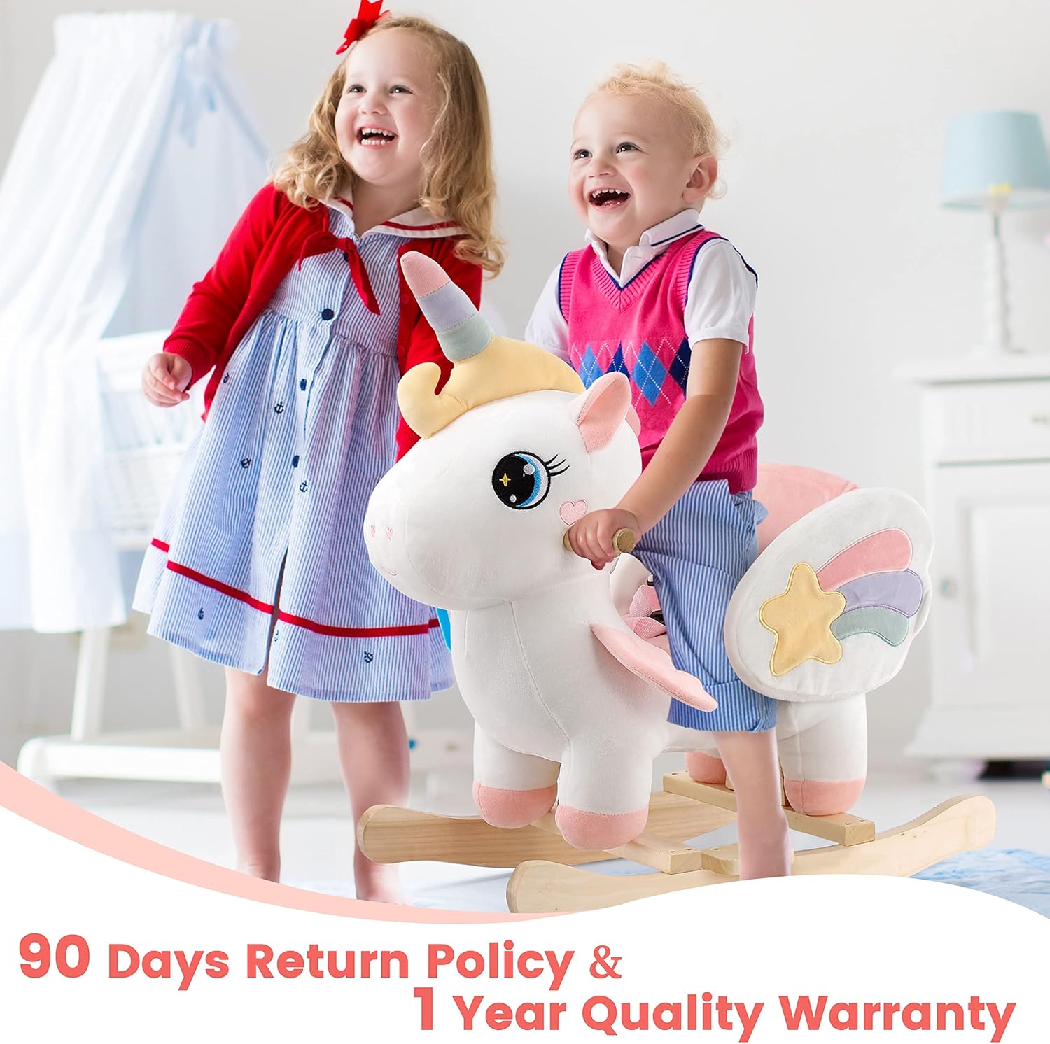 【Made of High-quality Solid Wood & PP Cotton, Comfy Rocking Time for Your Little Ones】This cute baby rocking chair is made of high-quality solid wood. With exquisite craftsmanship, you can feel it so smooth to the touch, without any burrs. Made of premium PP cotton, the stuffed unicorn baby rocker is extremely soft and comfortable. Riding on the unicorn rocker, your baby will enjoy a comfy & happy rocking time!