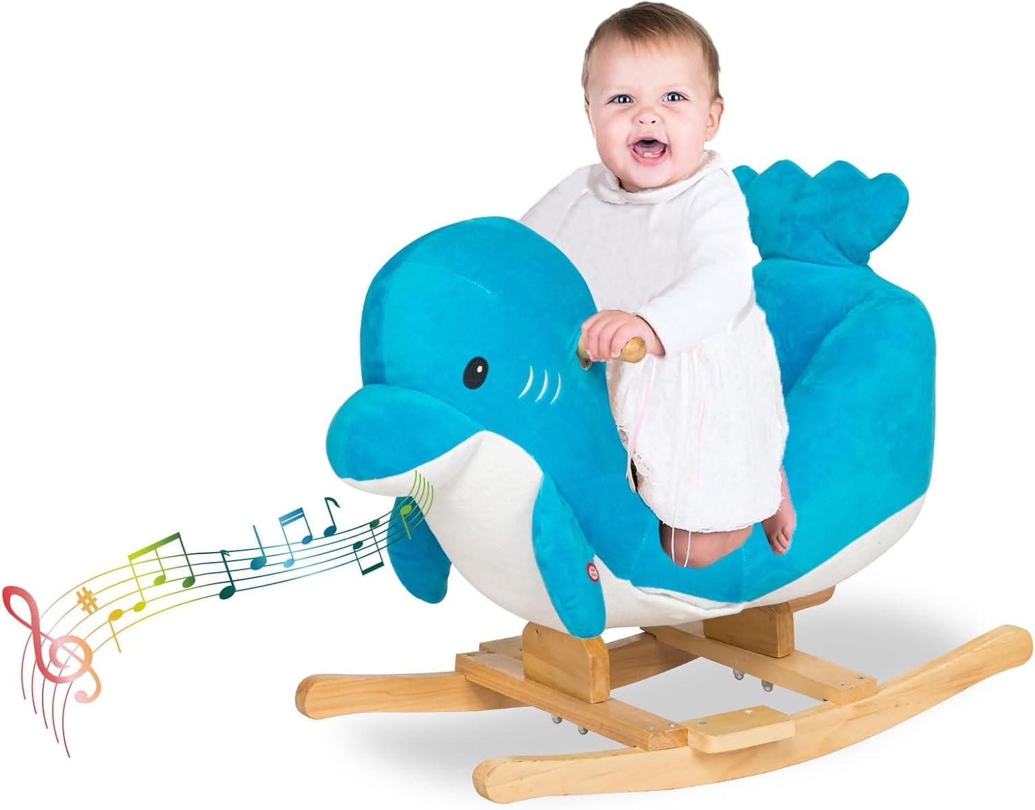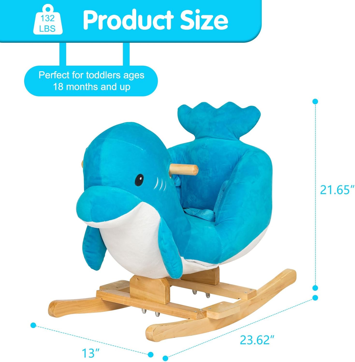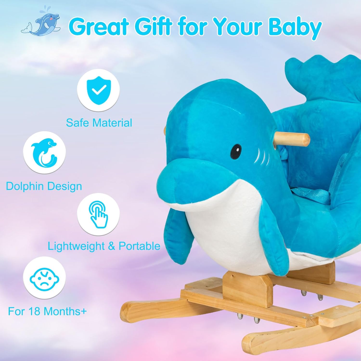 J-Sun-7 Baby Rocking Horse – Dolphin Themed Rocking Animal for Toddlers, Baby Rocker with Seat Belt and Lullaby Song, Wooden Rocking Horse Plush Ride On Toy, Gift for 18 Months+, Blue