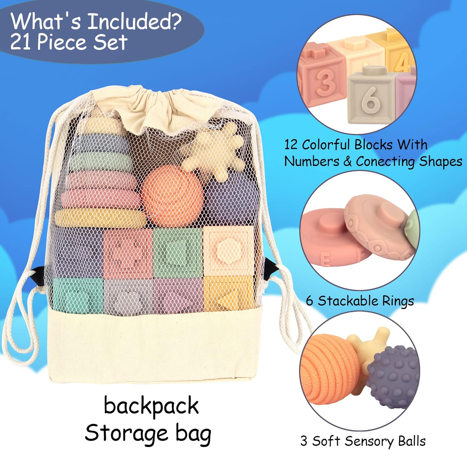 3 IN 1 BABY TOY SET Our 6 month+ old baby toy comes in a convenient set of 21 individual pieces including 12 different colored blocks, 6 soft stacking rings and 3 soft sensory toy balls. The perfect bundle for countless hours of fun!
