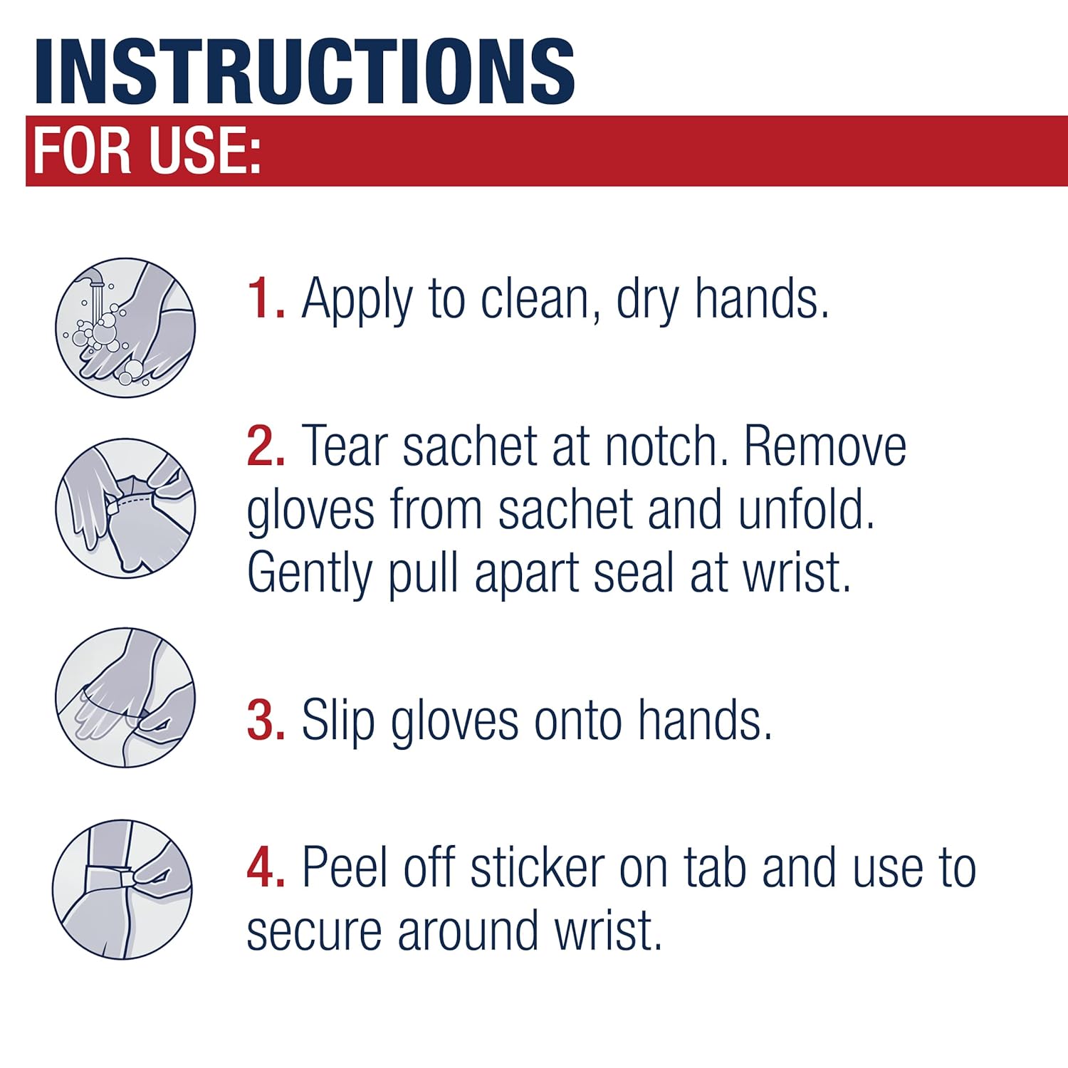 Application: Apply to clean, dry hands for at least 10 minutes (tear sachet at notch, remove from sachet and unfold, pull apart seal at wrist and slip onto hands)
