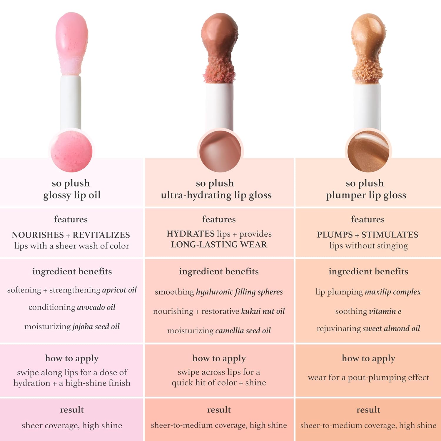 So Plush Ultra-Hydrating Lip Gloss: Amp up lips, delivers kissable shine, hydrates and protects lips all day long.