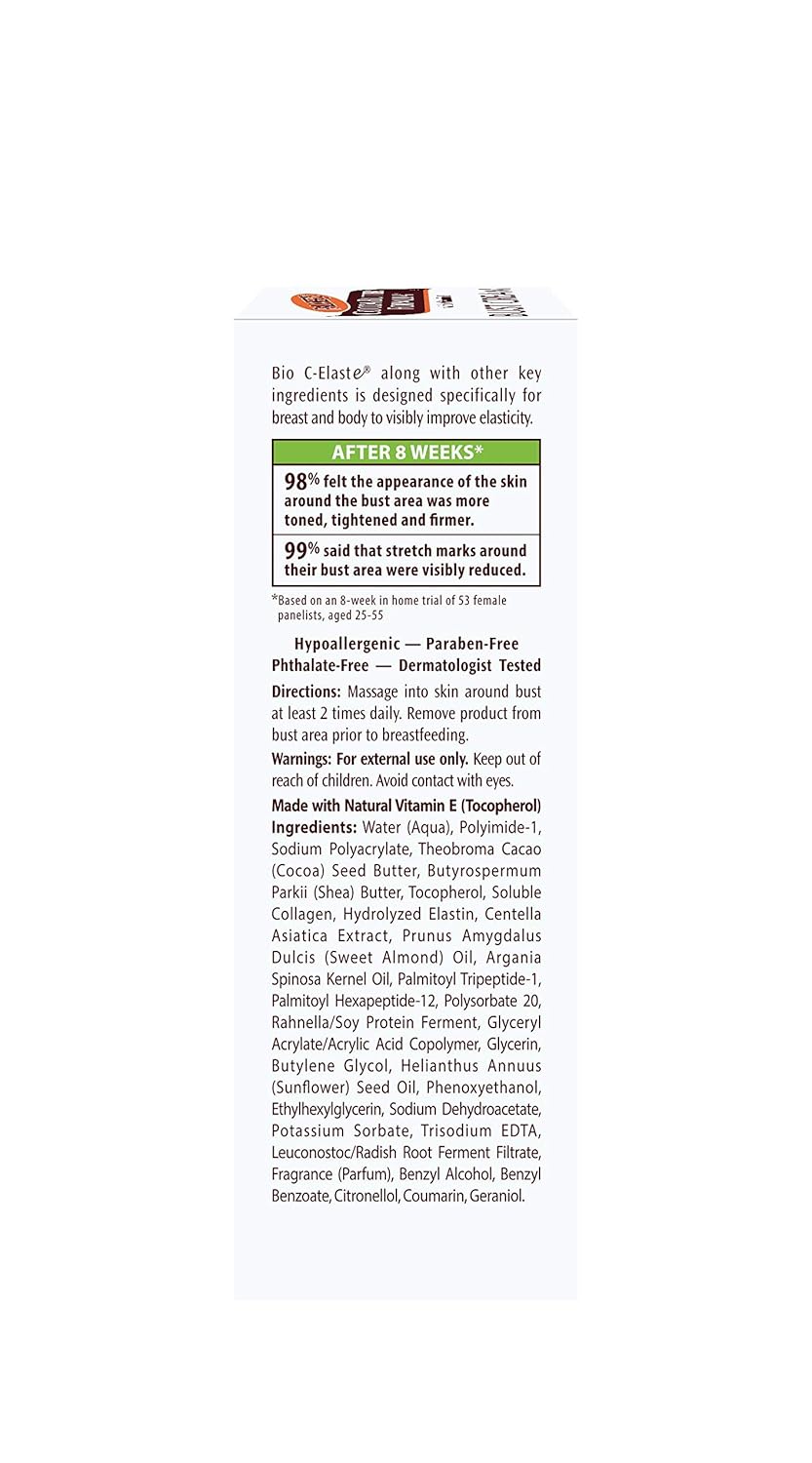 Palmer’s Cocoa Butter Formula Bust Cream is a specially formulated cream that smoothes on like a gel. It will firm and tone your bust area even after pregnancy and weight loss. Made with a unique blend of pure Cocoa Butter, Shea Butter and Vitamin E, to maximize your skin’s moisturization, while Collagen, Elastin and other proven ingredients help support the skin around the bust area and increase tone and firmness.