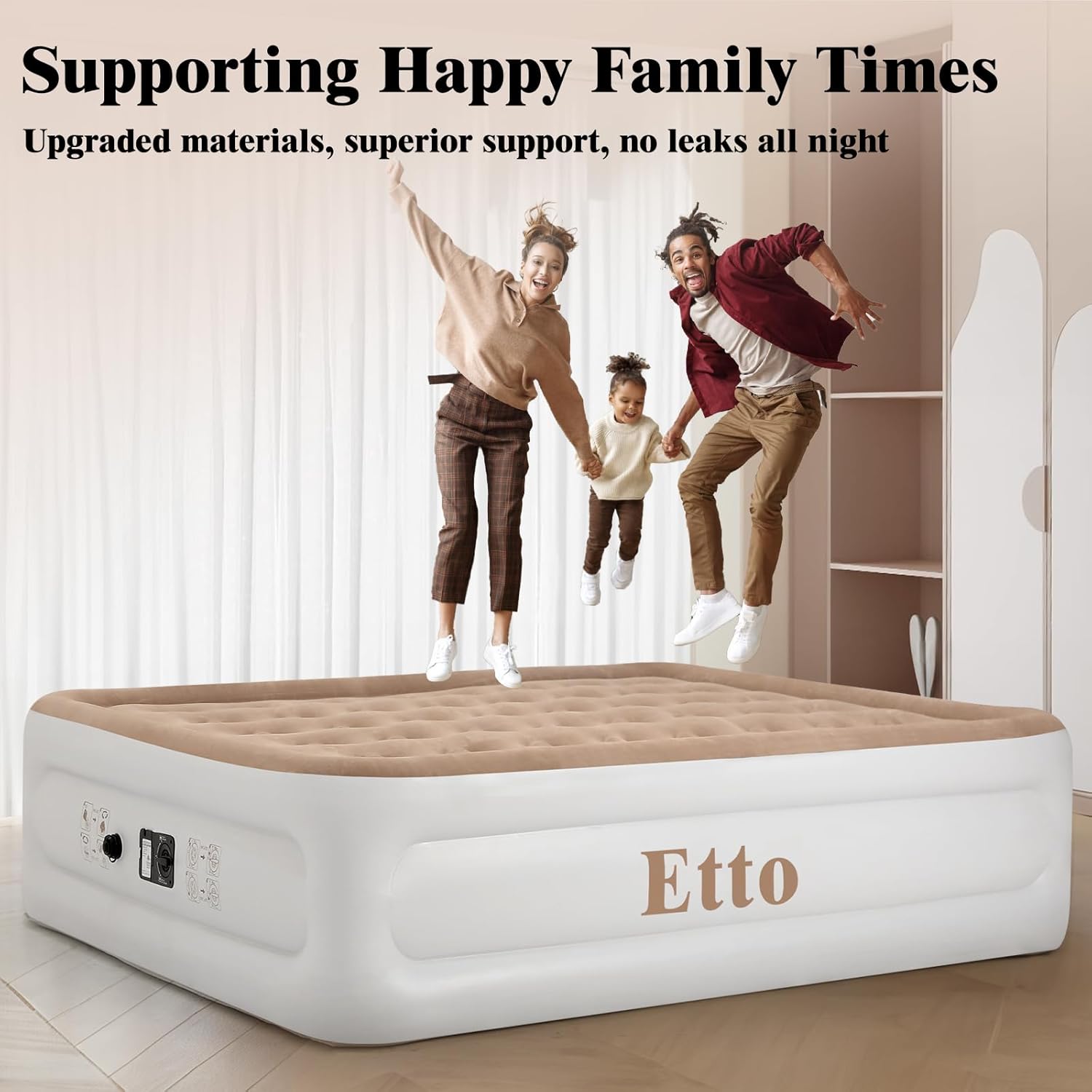 Sleep Tight & No Leaks: Crafted from thickened PVC, the Etto inflatable air mattress offers superior puncture resistance and long-lasting durability. Designed to stay fully inflated all night, it ensures no air leakage for uninterrupted comfort. The non-slip bottom adds extra stability, providing a secure and restful sleep experience