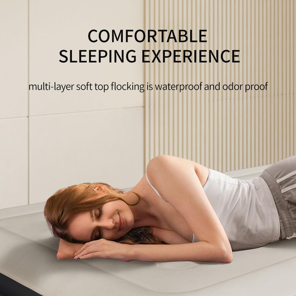 COMFORTABLE SLEEPING: Twin air mattress multi layer soft top flocking creates an amazingly comfortable sleeping experience,soft top flocking is waterproof and odor proof for a more peaceful sleep
