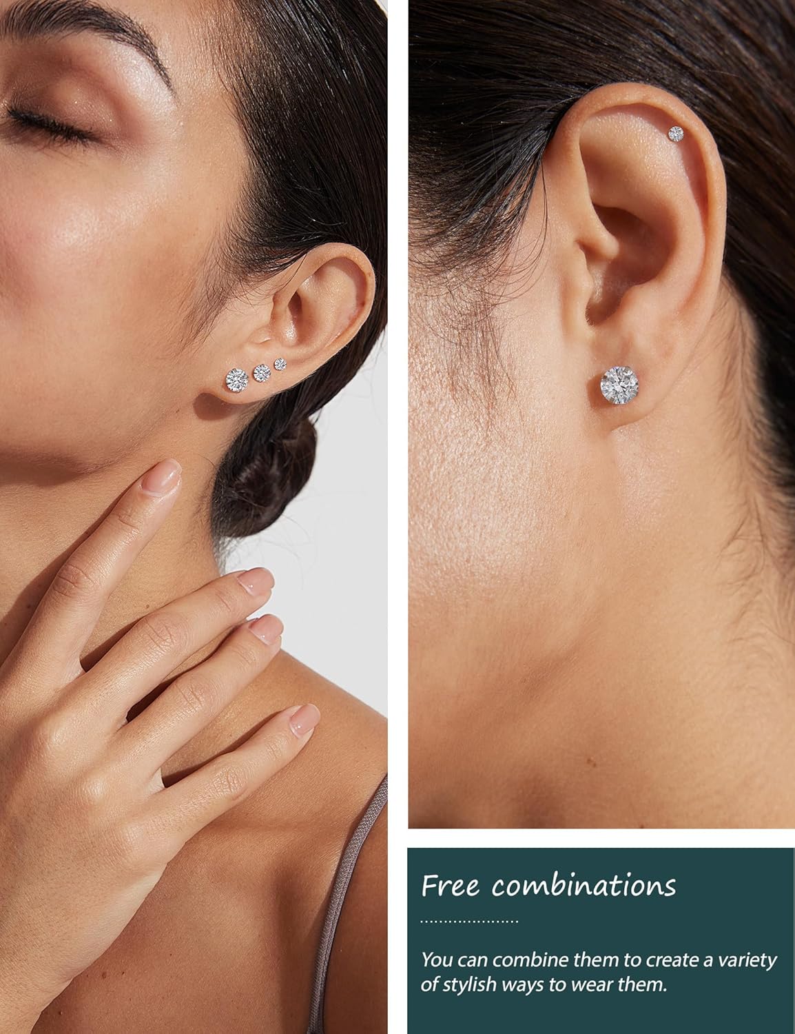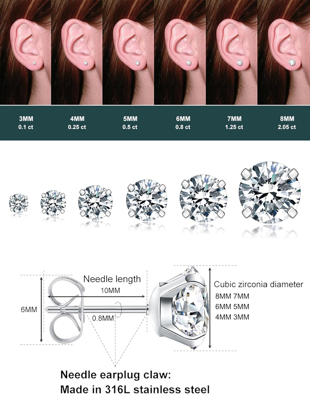6 Pairs Stud Earrings Set, Hypoallergenic Cubic Zirconia 316L Earrings Stainless Steel CZ Earrings 3-8mm (Steel color)