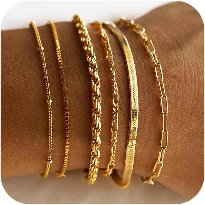 DEARMAY Gold Bracelets for Women Waterproof, 14K Real Gold Jewelry Sets for Women Trendy Thin Dainty Stackable Cuban Link Paperclip Chain Bracelet Pack Fashion Accessories Gifts for Womens