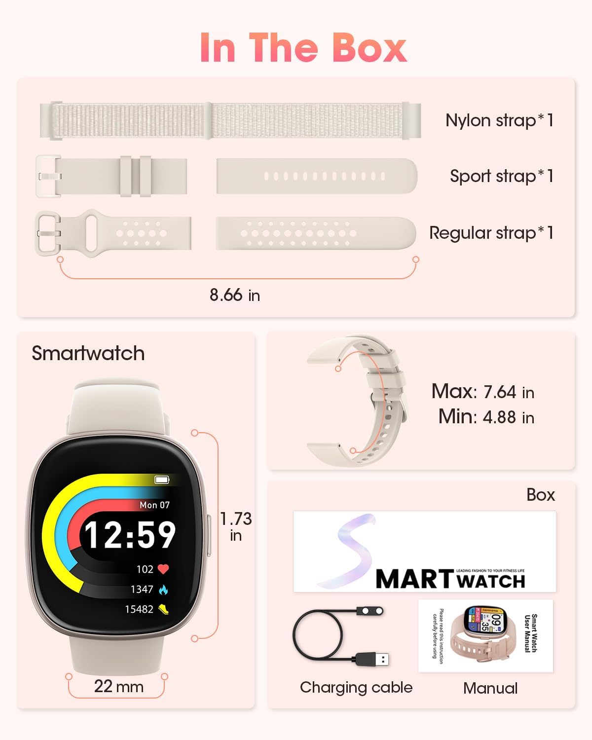 24-Hour Health Activity Tracker: Prioritize your well-being with smart watches for men continuous health monitoring. Smart watches for women track your Heart Rate, Blood Oxygen levels(SpO2) and Sleep patterns (deep sleep, light sleep, REM analysis, get a better sleep habit by viewing your sleep data)around the clock. Take charge of your wellbeing and make informed decisions for a healthier lifestyle
