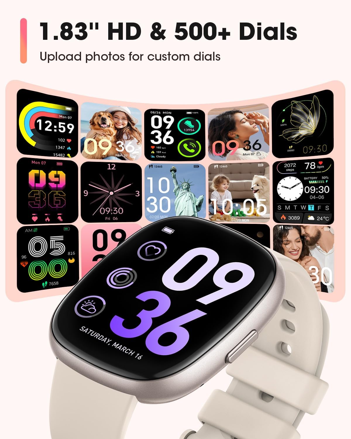 1.83 Color screen & 500+ watch face: Womens watch with 1.83-inch touch screen and 4-level adjustable brightness, clearer display in sunlight, more convenient operation. Mens watches have more than 500+ unique online watch faces to choose from, you can also choose any picture on your phone as wallpaper to show your personal style
