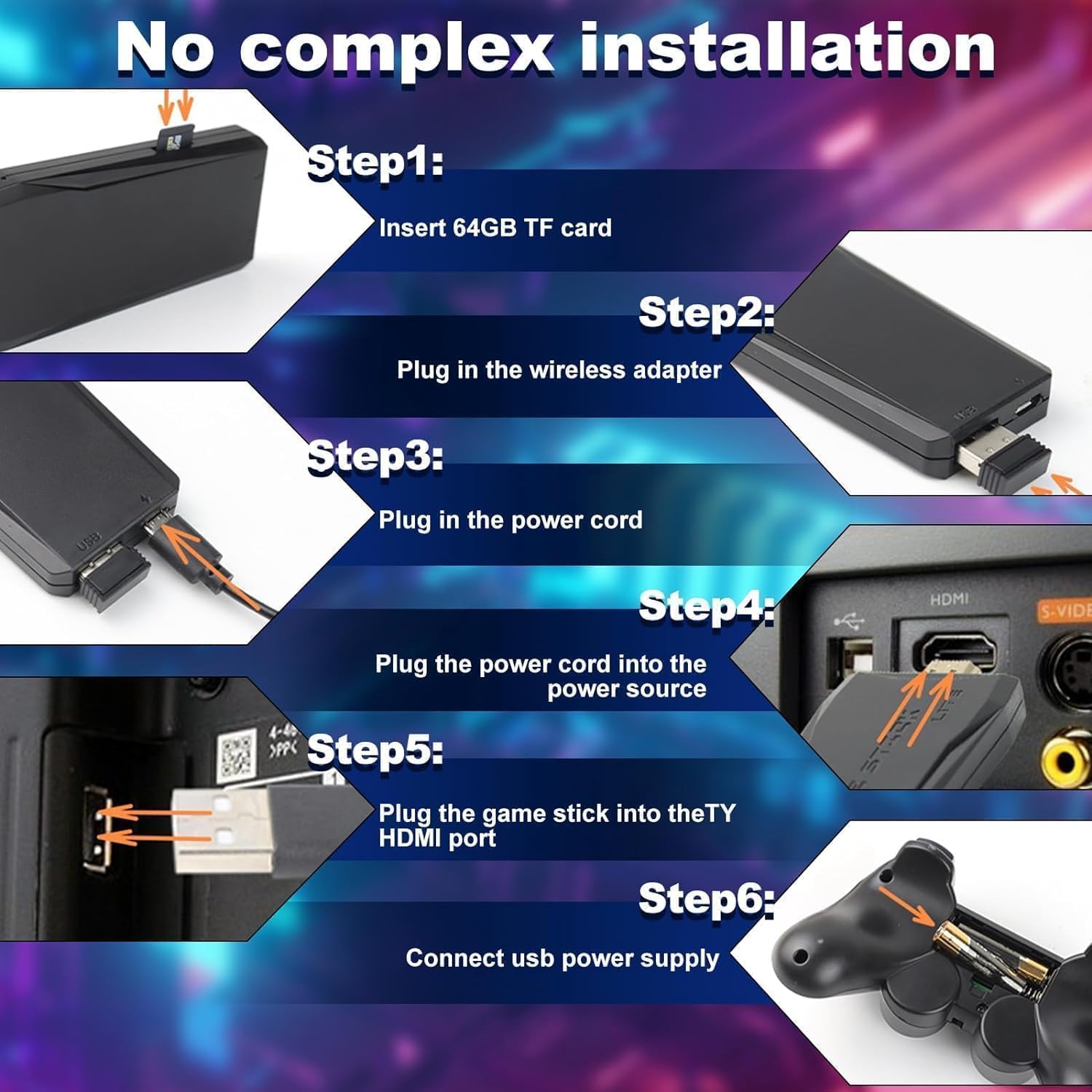 【Plug and Play Game Experience】Just connect the game console stick to the power supply, then plug it into the TV, adjust the TV source to the HD channel to display the game list screen on the TV. The specific steps are as follows: 1. Connect the HD output of the TV first 2. Insert the built-in TF game content card 3. Use the charging adapter to connect the power supply to automatically turn on. 18 simulators are pre-installed, equipped with upgraded chips, the game is smoother and more stable.