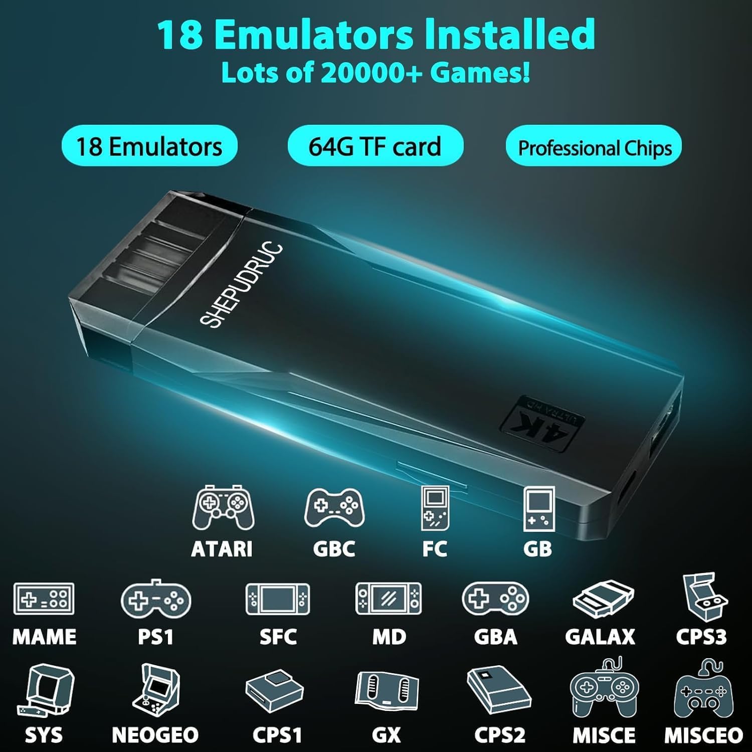 【Built-in 20,000+ Super Classic Retro Games】This SHEPUDRUC wireless TV game console has built-in 20,000+ rich and massive classic games. No need to download and install by yourself, no Internet required, just connect to the TV to play 20,000+ classic games. Take you back to your childhood memories and enjoy family entertainment time immediately!