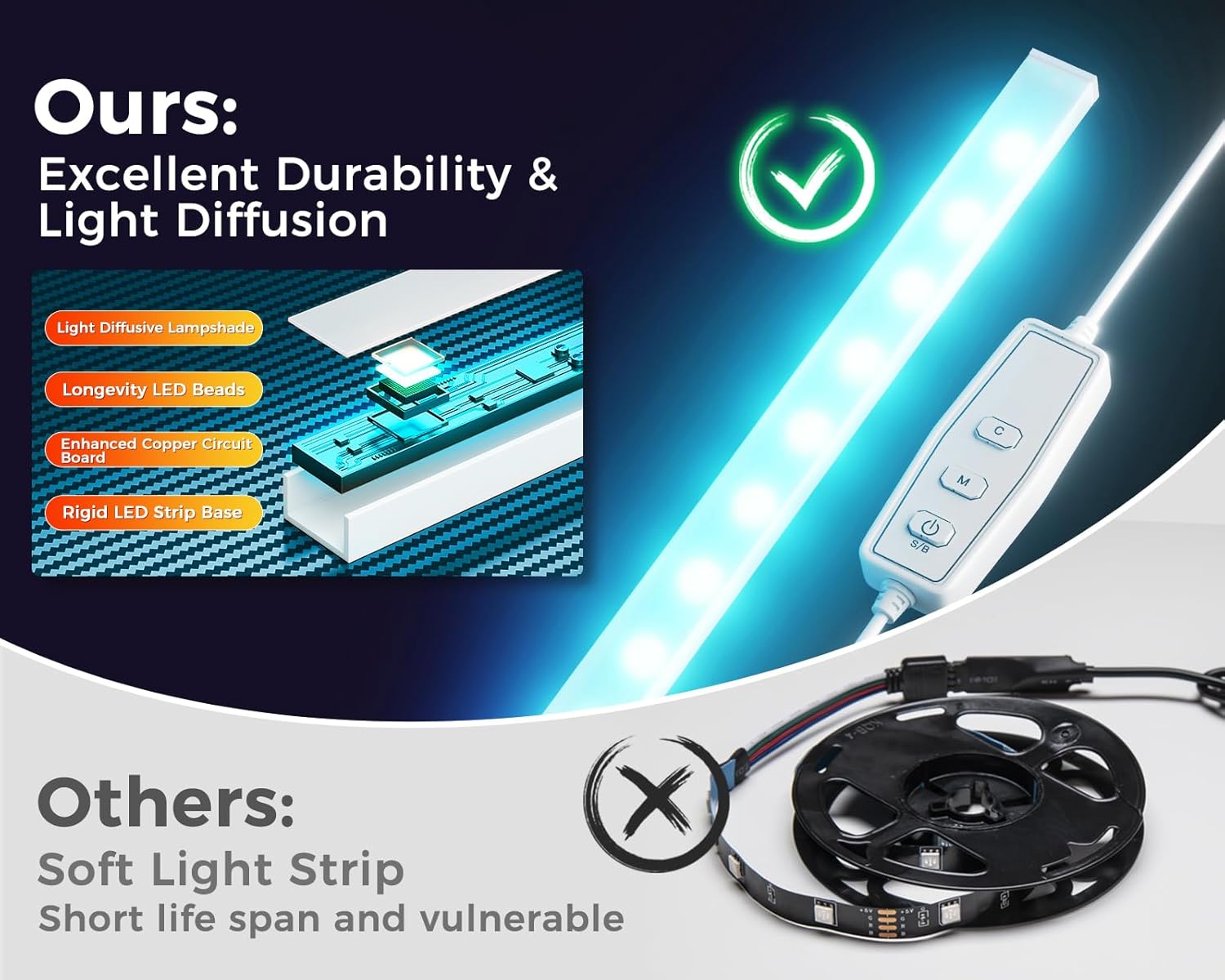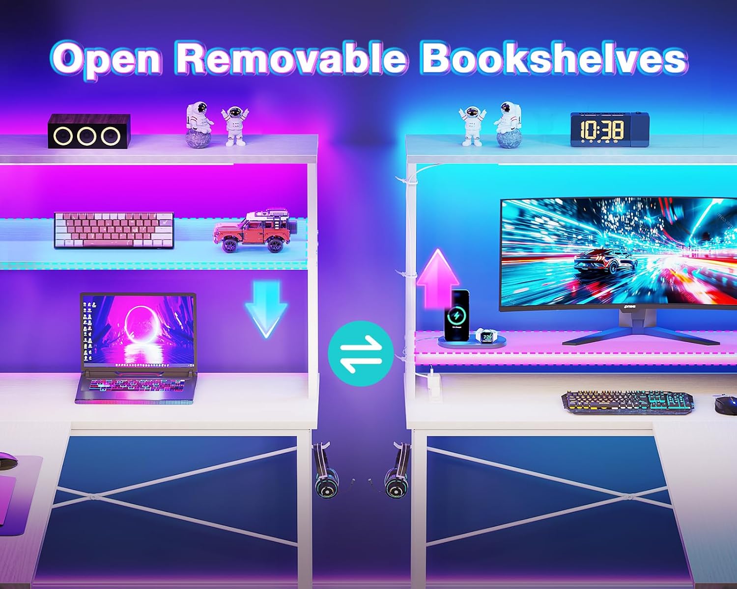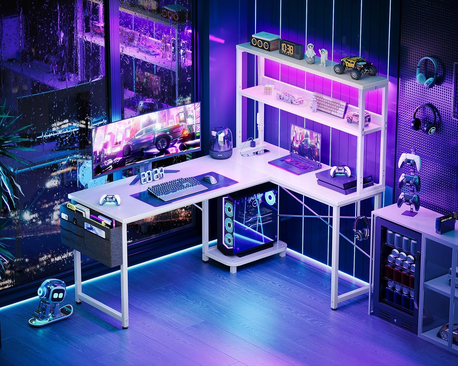 【AODK Reversible L Shape Desk】This L shaped gaming desk comes with storage shelves, power outlet, light strip, CPU stand, headphone hook and storage bag. The L desk is reversible and the top hutch can be fixed on the left or right side according to your needs, maximizing your limited space and ideal for corner spaces. A great choice for home office, game, office, studio and living room.