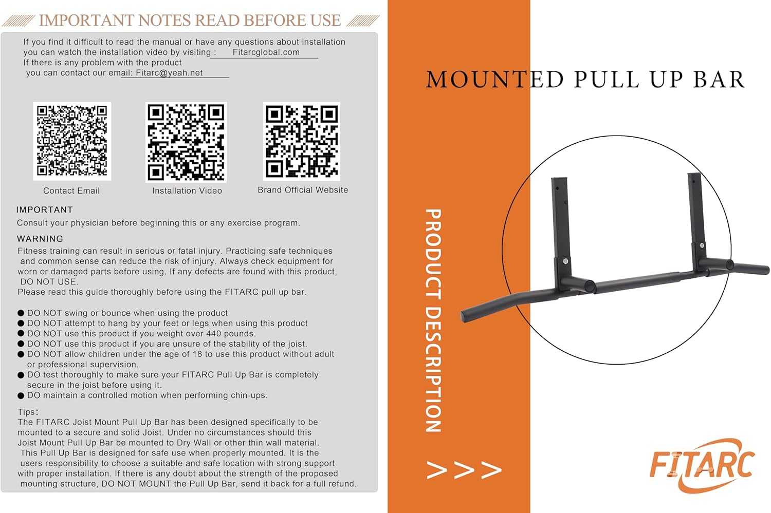 Installation conditions: The FITARC Joist Mount Pull Up Bar has been designed specifically to be mounted to a secure and solid Joist. Under no circumstances should this Joist Mount Pull Up Bar be mounted to Dry Wall or other thin wall material