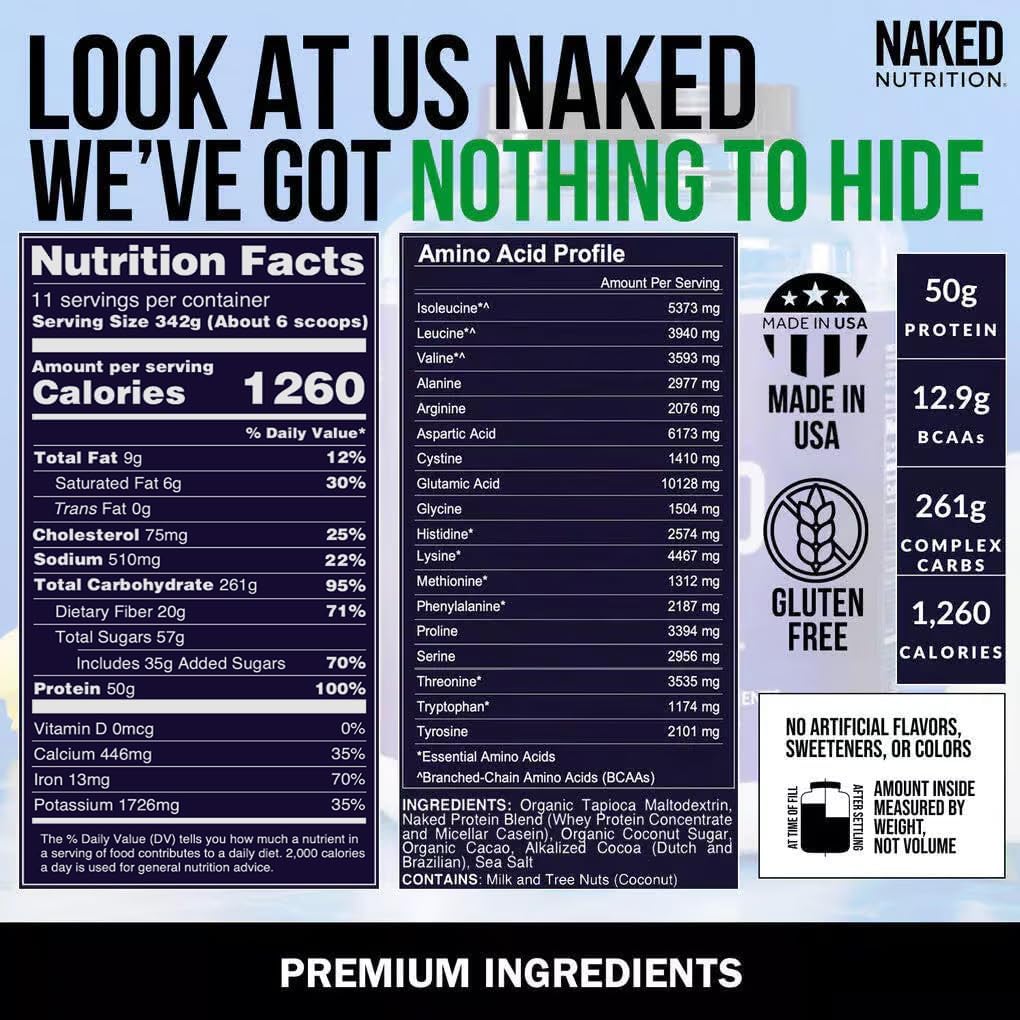 MAXIMUM NUTRITION: Each serving of our double chocolate weight gain powder contains 50g of Protein, 261g of Complex Carbs, 1,260 Calories and 12.9g of BCAAs (branched-chain amino acids). Contains no artificial sweeteners, flavors, or colors and is GMO Free, No rBGH or rBST, Soy Free and Certified Gluten Free.