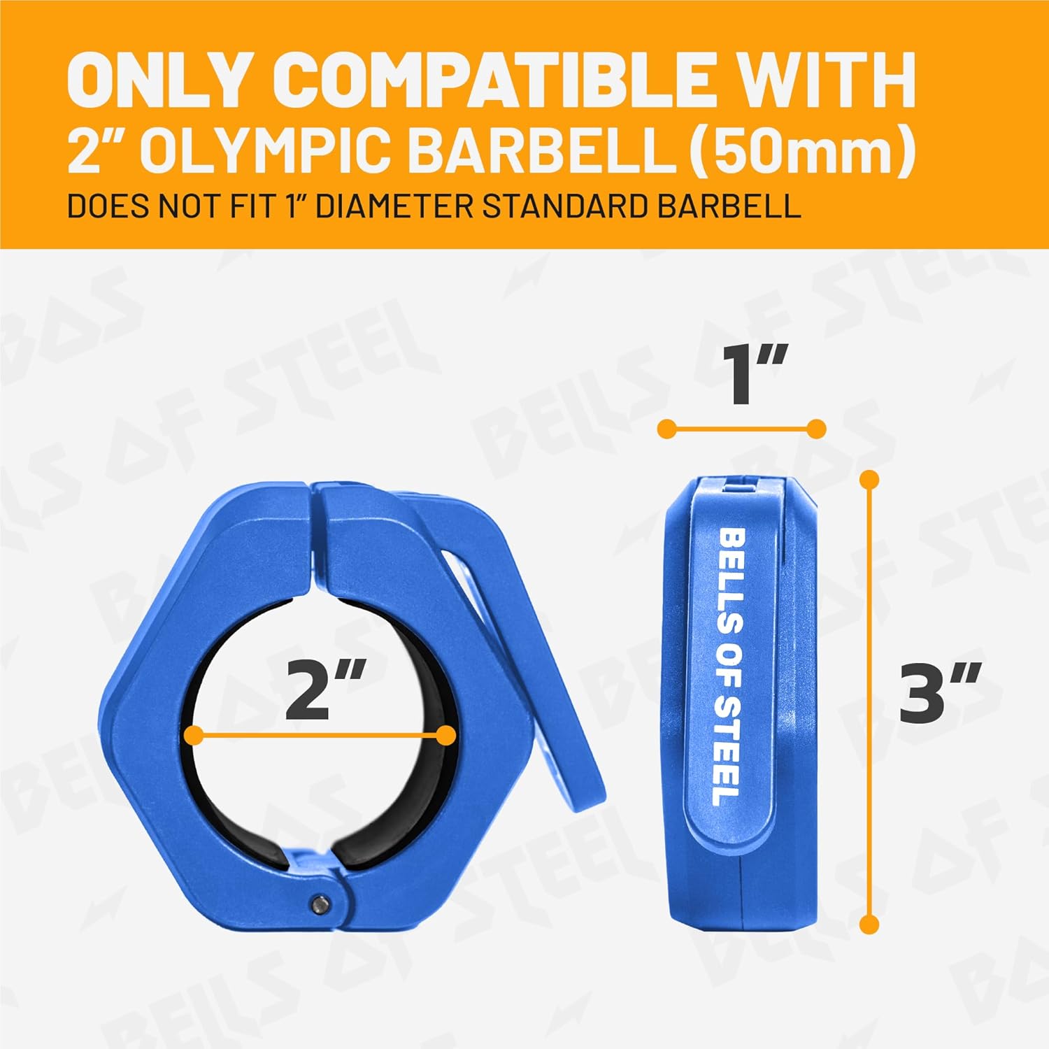 What’s in the Package – Your new Bells of Steel Weight Bar Clamps with a rubberized inner layer to protect your bar. 0.2lb each; 1.06in width, 3in outer diameter.