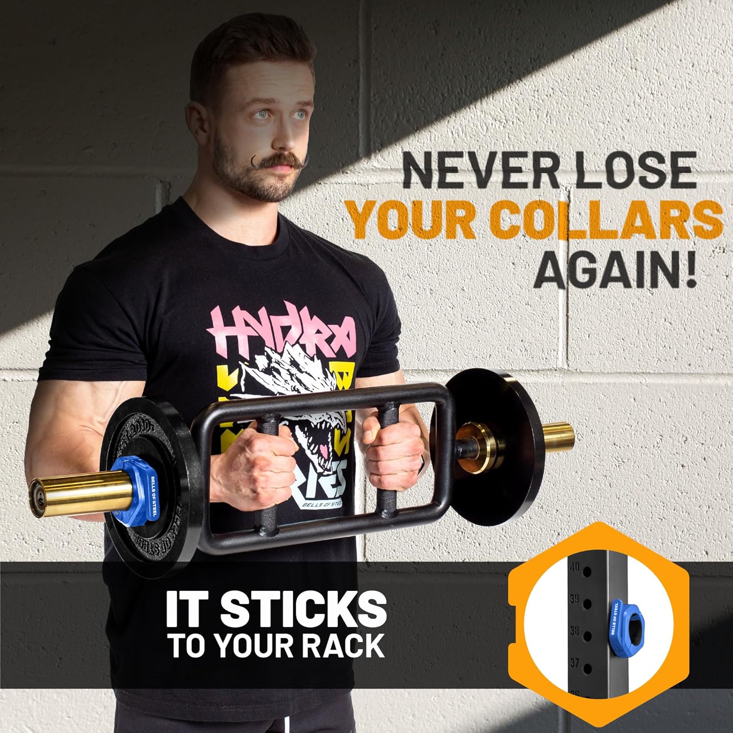 You’ll LOVE the magnetic clamp collars. They’re magnetized, so you can stick ’em anywhere on your steel power rack.