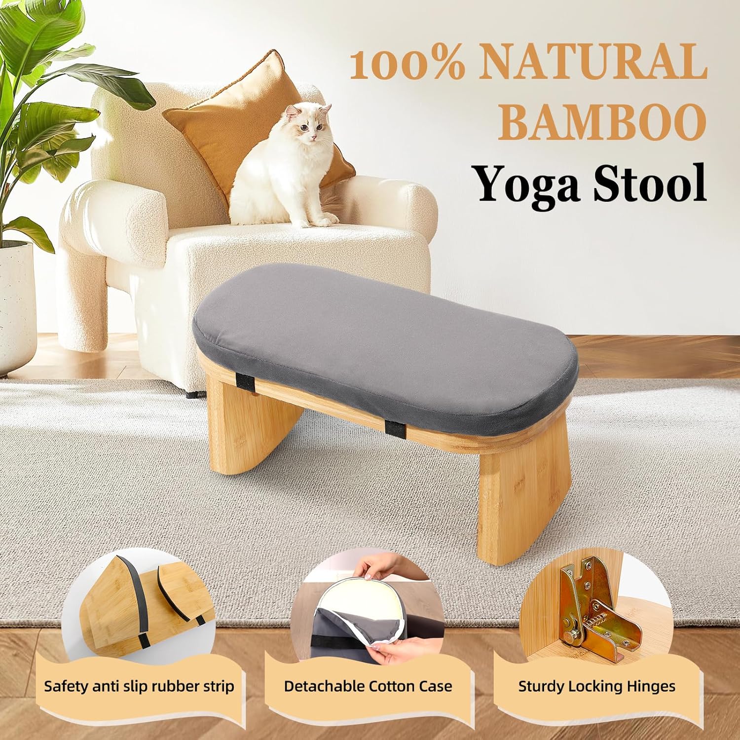 100% Natural Bamboo Wood: This meditation chair is made of sustainable bamboo wood and comes with a durable, machine-washable, removable soft cushion for a comfortable use experience.