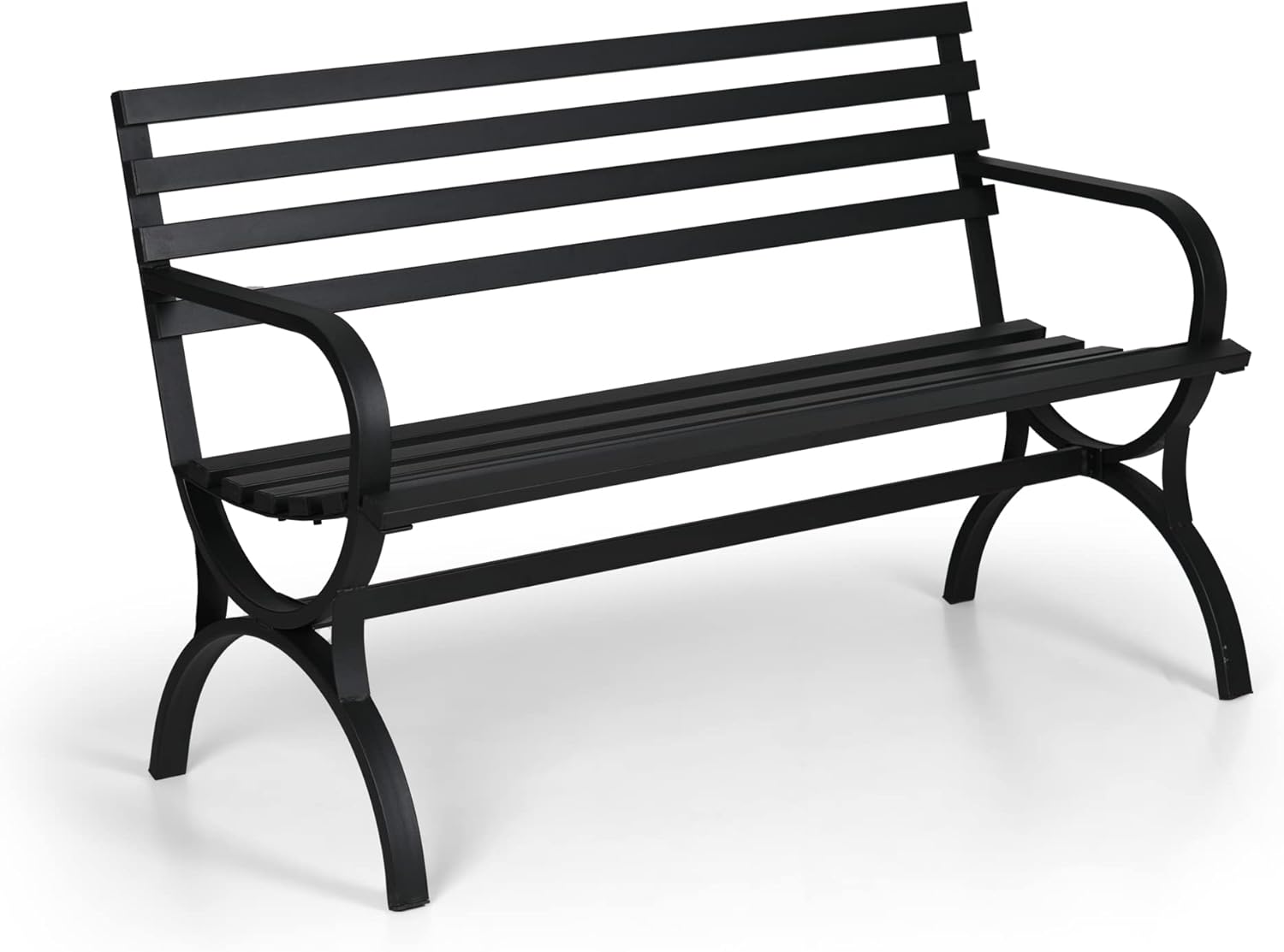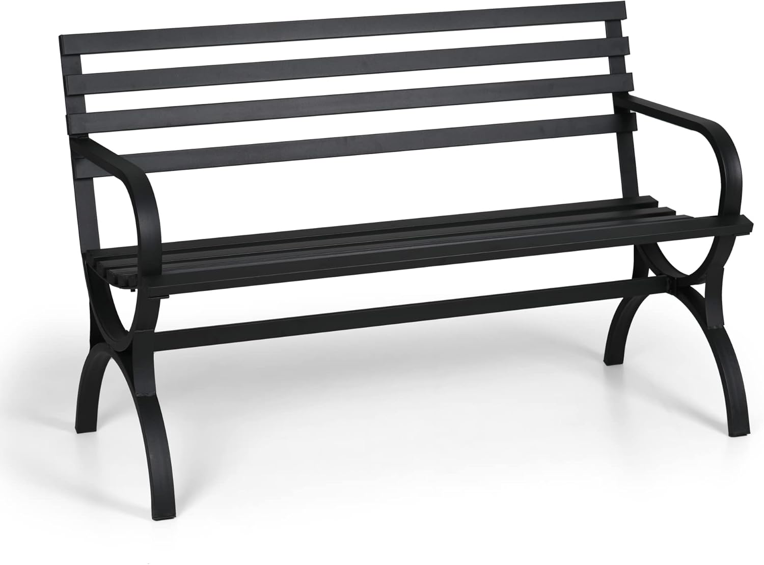 PHI VILLA Outdoor Garden Bench, 48” Long Metal Steel Bench with Backrest and Armrests, Modern Slatted Design for Patio, Lawn, Yard, Porch – Black