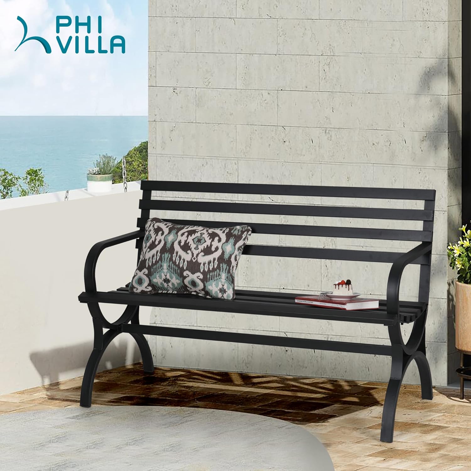 Be the first to review “PHI VILLA Outdoor Garden Bench, 48” Long Metal Steel Bench with Backrest and Armrests, Modern Slatted Design for Patio, Lawn, Yard, Porch – Black”