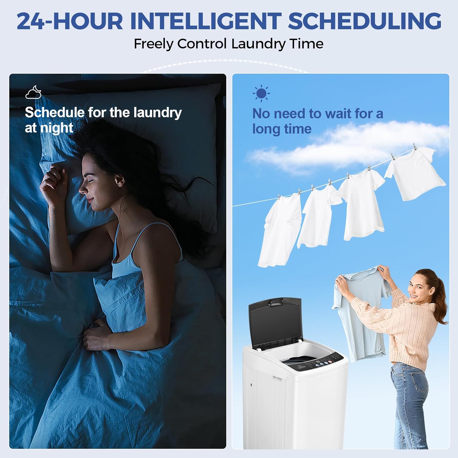 【Extremely Energy Saving】—With different levels of water control: L/16L M/23L H/30L. Adjust the different washing mode and water level through the wash push-button. This portable washing machine has a 24 hour smart delay cleaning function. You can preset the washing start time according to your needs. Equiped with high quality and durable motor, providing stable power. Saving as much 84% energy consumption comparing to similar model. Washing machine is able to save money for your household.