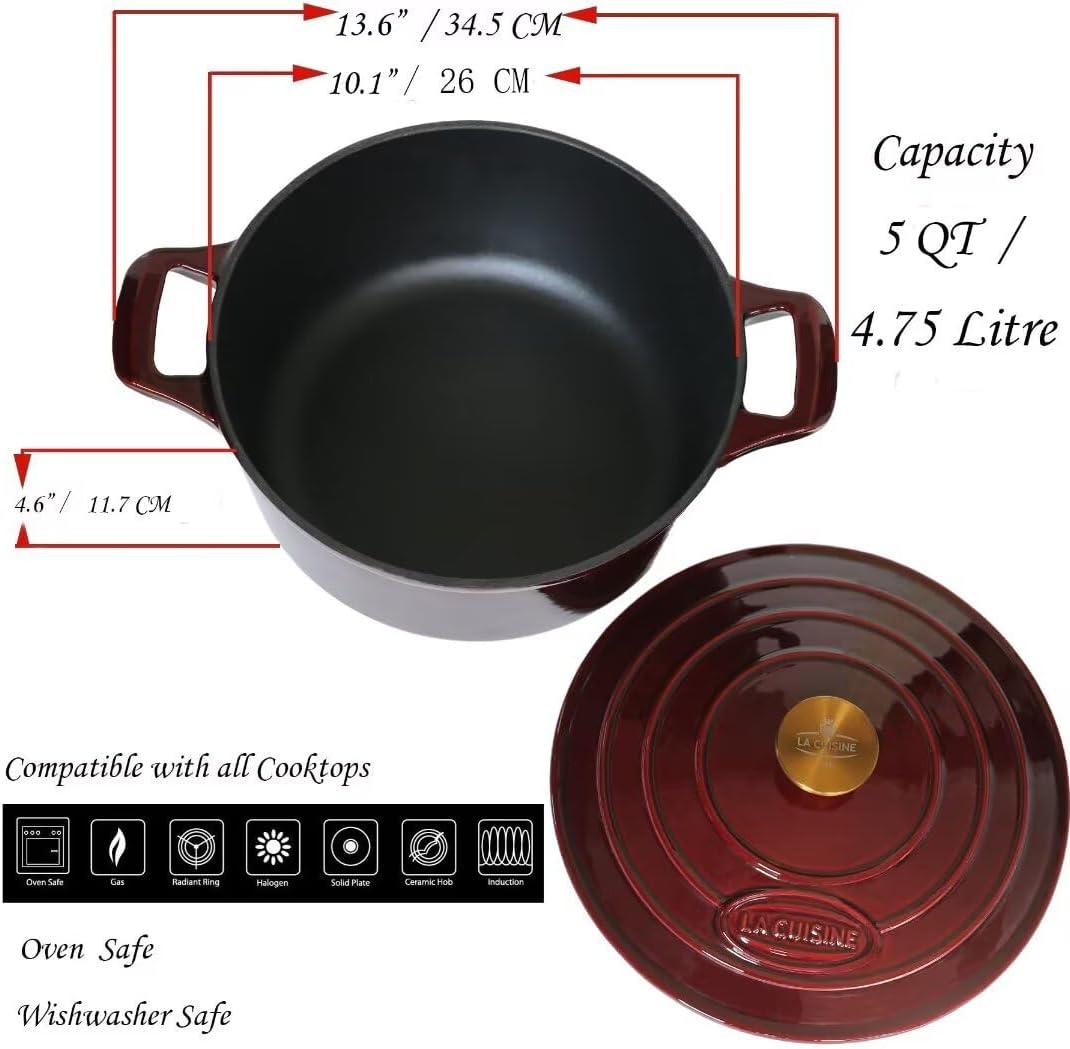 La Cuisine Enameled Cast Iron Dutch Oven Casserole Dish Pot with Lid, 5 QT 10.3“ /26cm Dia. Internal Matte Black Enamel Coating Gold-Plated SS Lid Handle Oven Safe up to 500° F, Cranberry