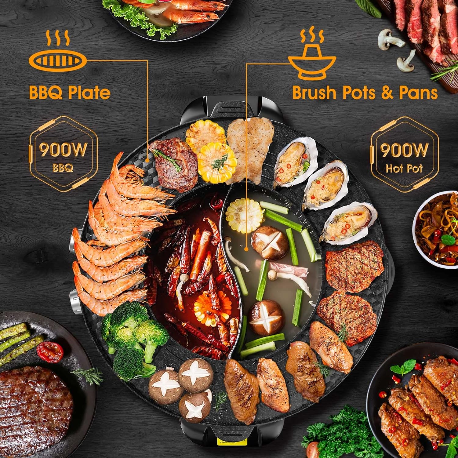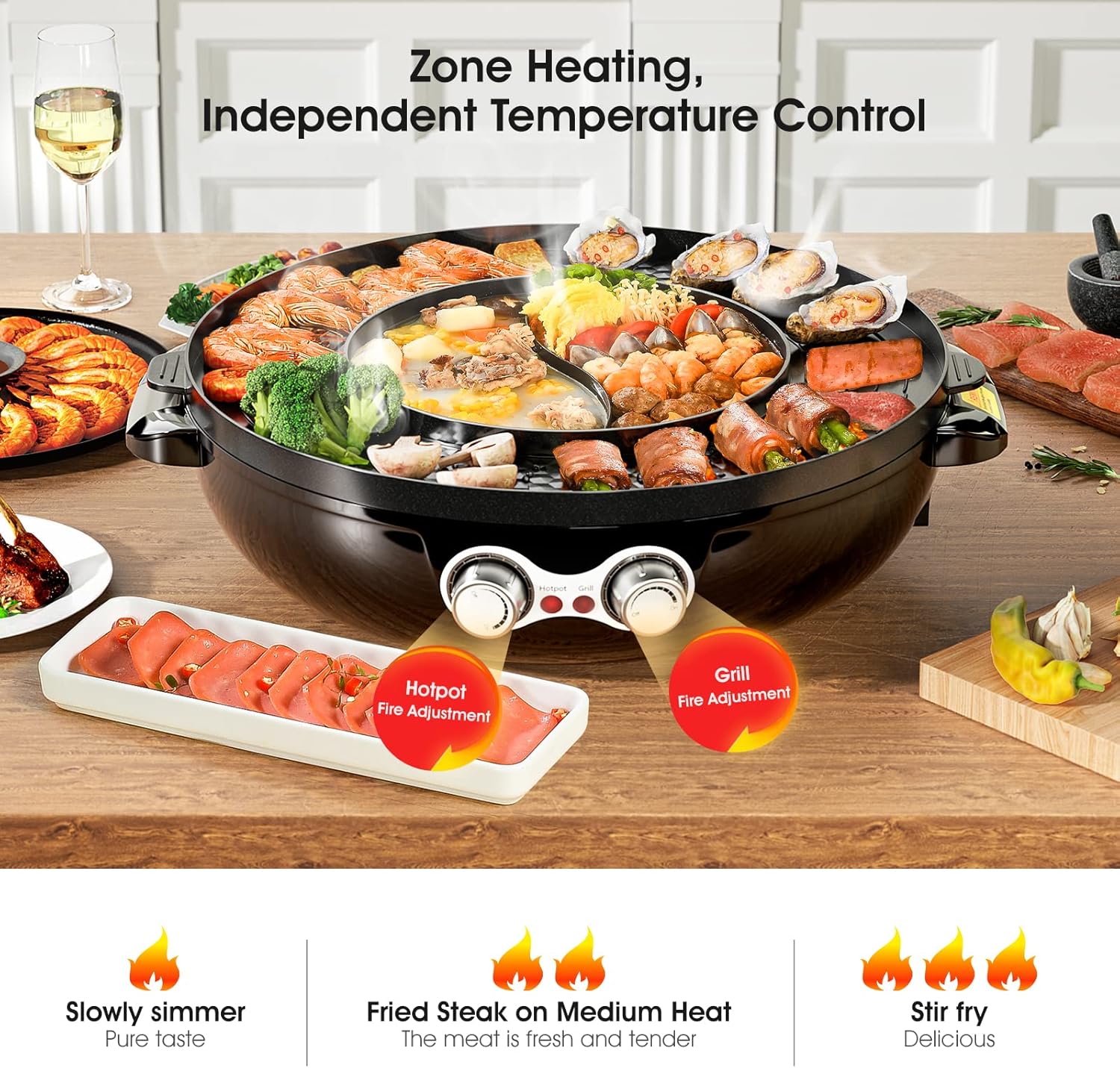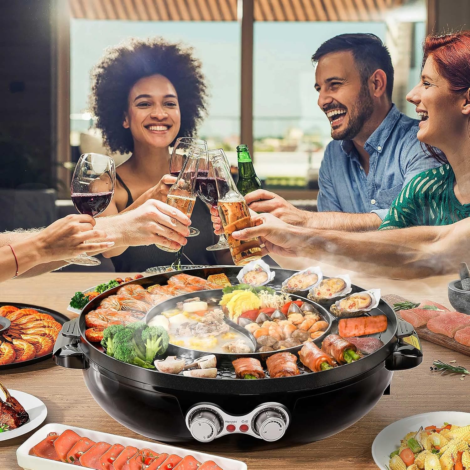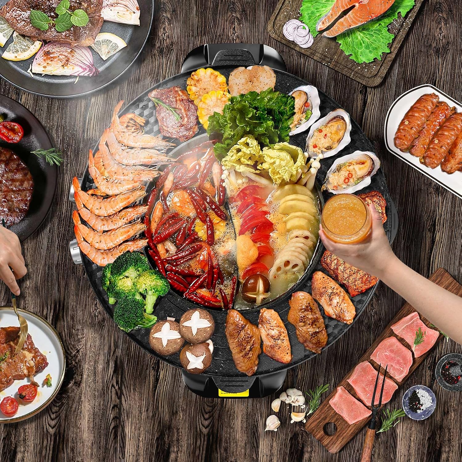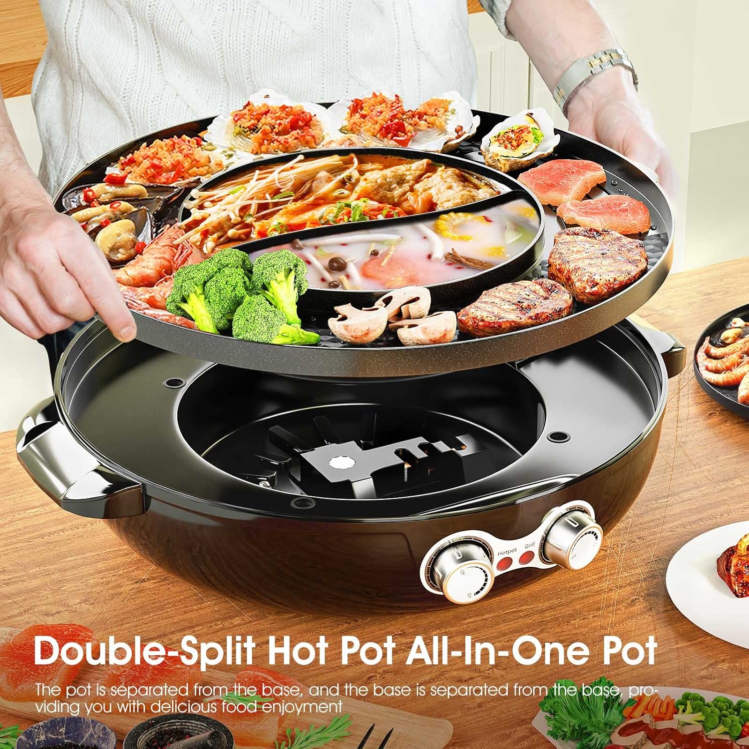 2 in 1 Grill &Hot Pot: The electric hot pot grill combines hot pot and grill for multipurpose use, allowing you to enjoy hot pot and barbecue simultaneously. Dual-purpose offers double fun.