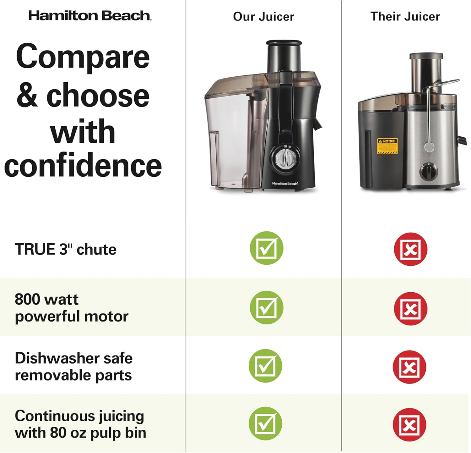 COMPARE AND CHOOSE WITH CONFIDENCE: Compare the competition to our extra-large 3” chute, 800 watts of power, 80 oz. pulp bin and 3 year warranty. Plus, the removable parts are dishwasher safe.