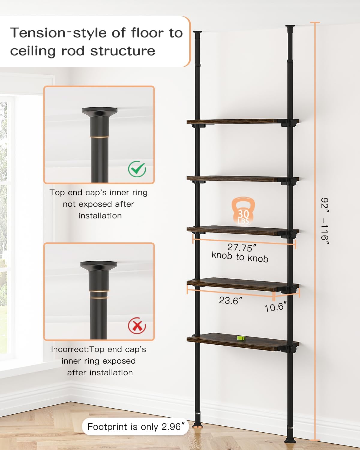 The floor-to-ceiling bookshelf takes up minimal floor space and fits perfectly in small, narrow areas, exploiting the wall space without eating up the floor area, giving you a tidy and clean room. No matter where you place it, it can always perform at its maximum potential.