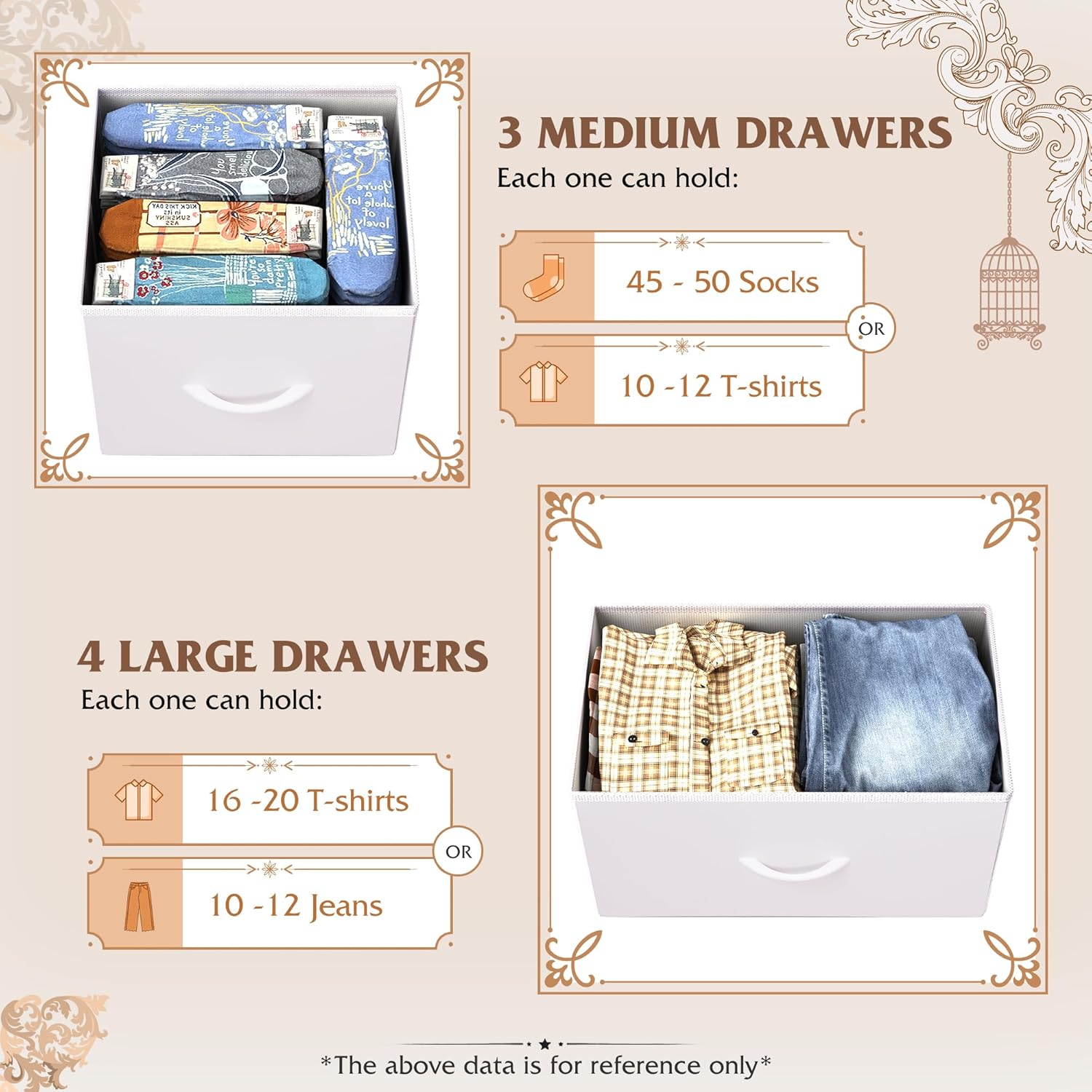 Roomy Storage Space: The dresser features 7 foldable deep drawers, which provide endless organizational possibilities and protect your privacy as well. The wood top is perfect to place vase, photos, mirror and frequently used items.