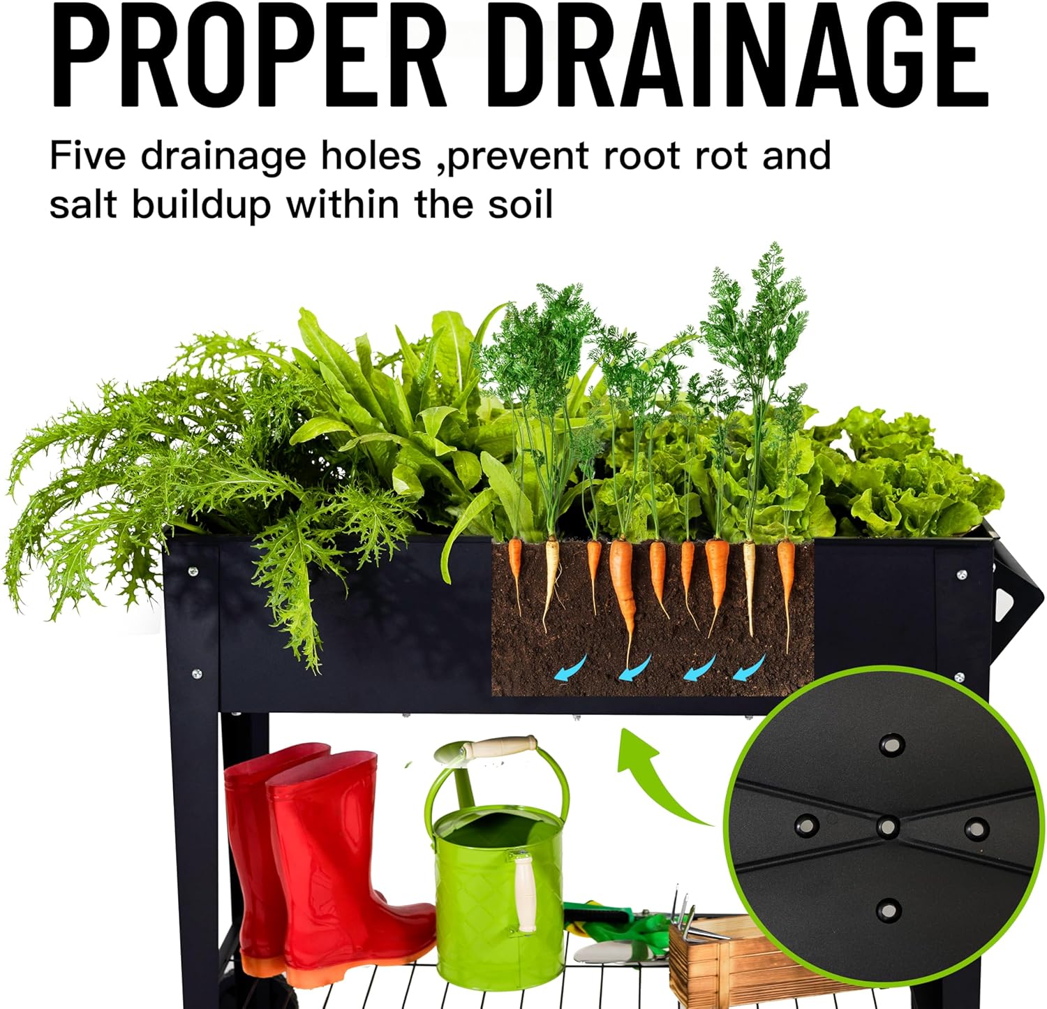 The raised garden beds outdoor combining 2 crossing drainage lines with 5 drainage holes, Allows excess water to drain out and prevent the waterlogging.