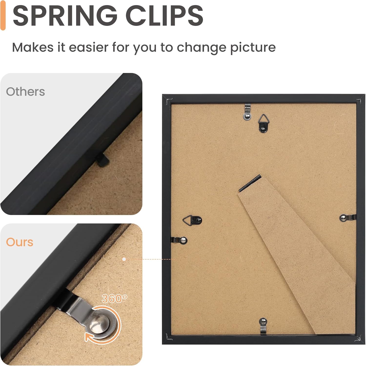 【Easy Mounting & Display】Each picture frame is equipped with a stand for tabletop display, and hanging hook for wall mounting, whatever hanging vertically or horizontally. The spring type action on the back helps you change the photo easily.