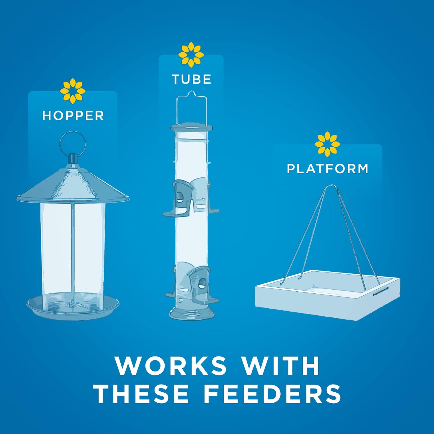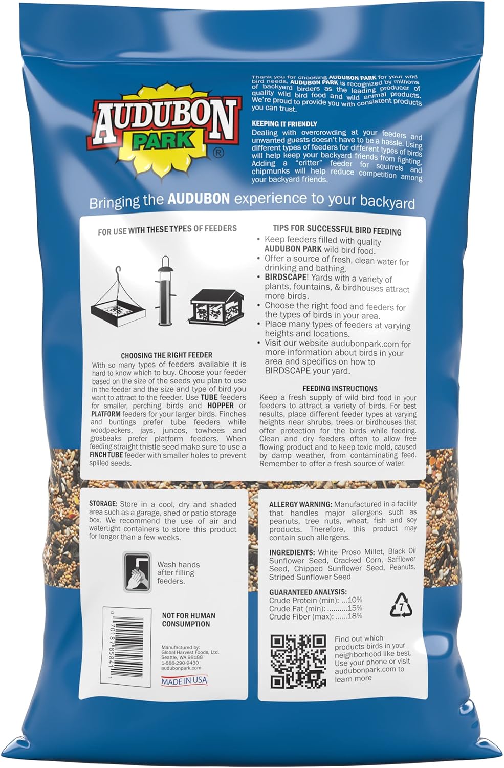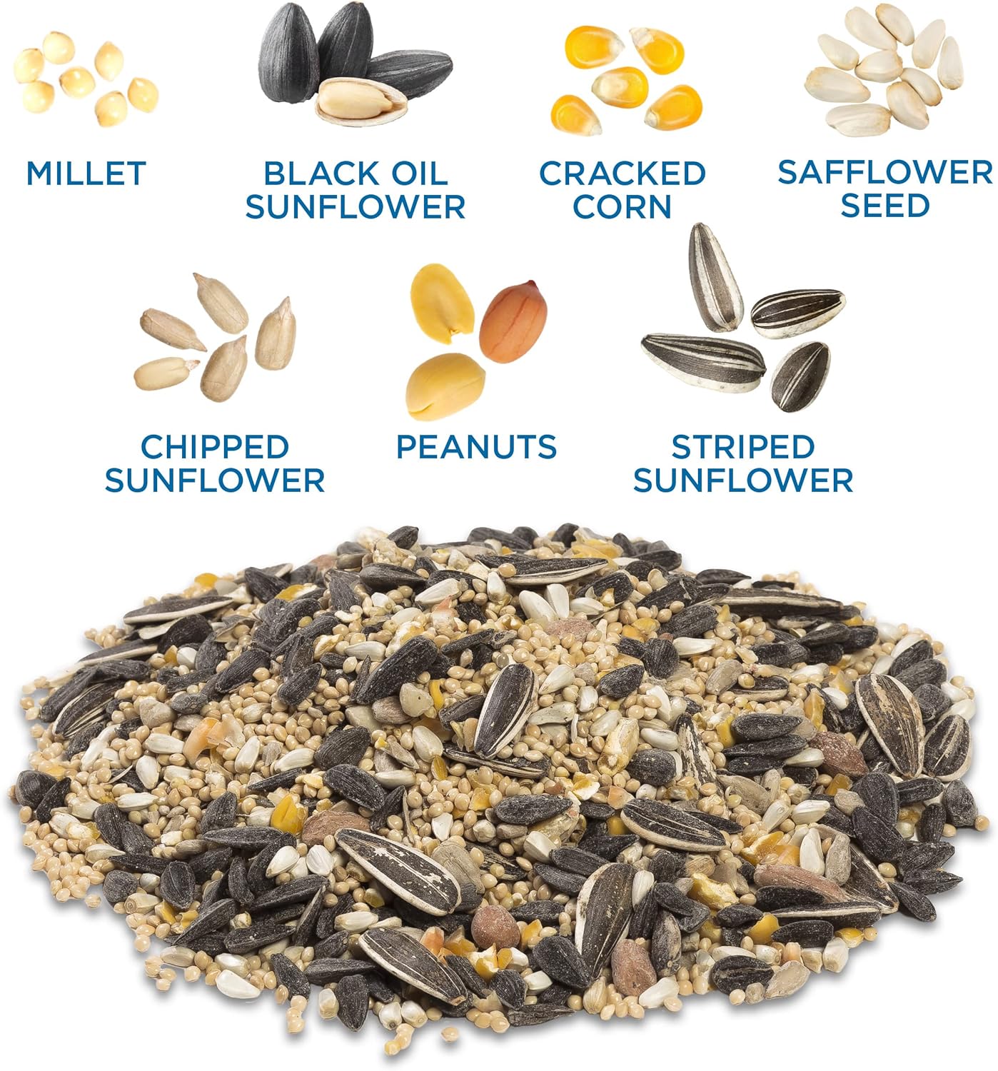 Premium blend; white proso millet, black oil sunflower seeds, cracked corn, safflower seeds, chipped sunflower seeds (shell-free), peanuts and striped sunflower seeds