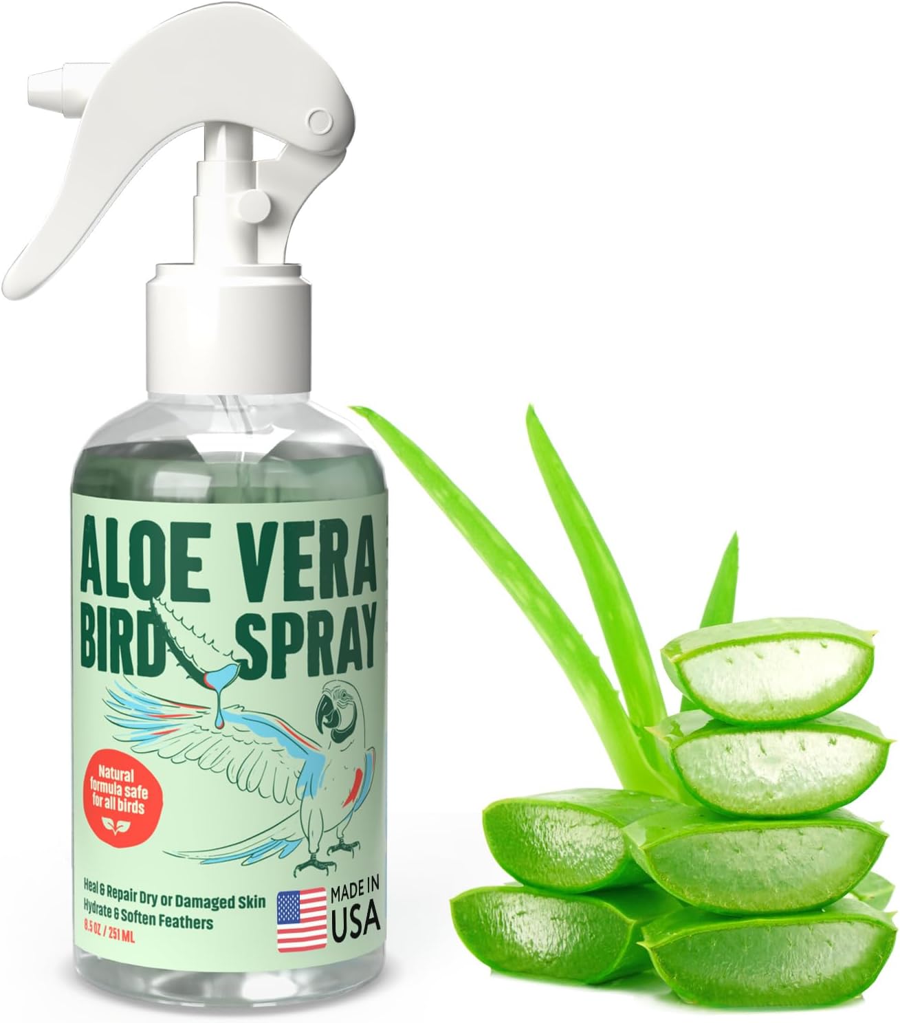 Relieves & Prevents Dry & Itchy Skin: Aloe Vera Bird Spray is an 8oz non-toxic formula safe for all birds that provides relief for dry or itchy skin. Spray onto the skin and body of your parrot, parakeet, cockatiel, and all other birds to keep skin hydrated and feathers soft