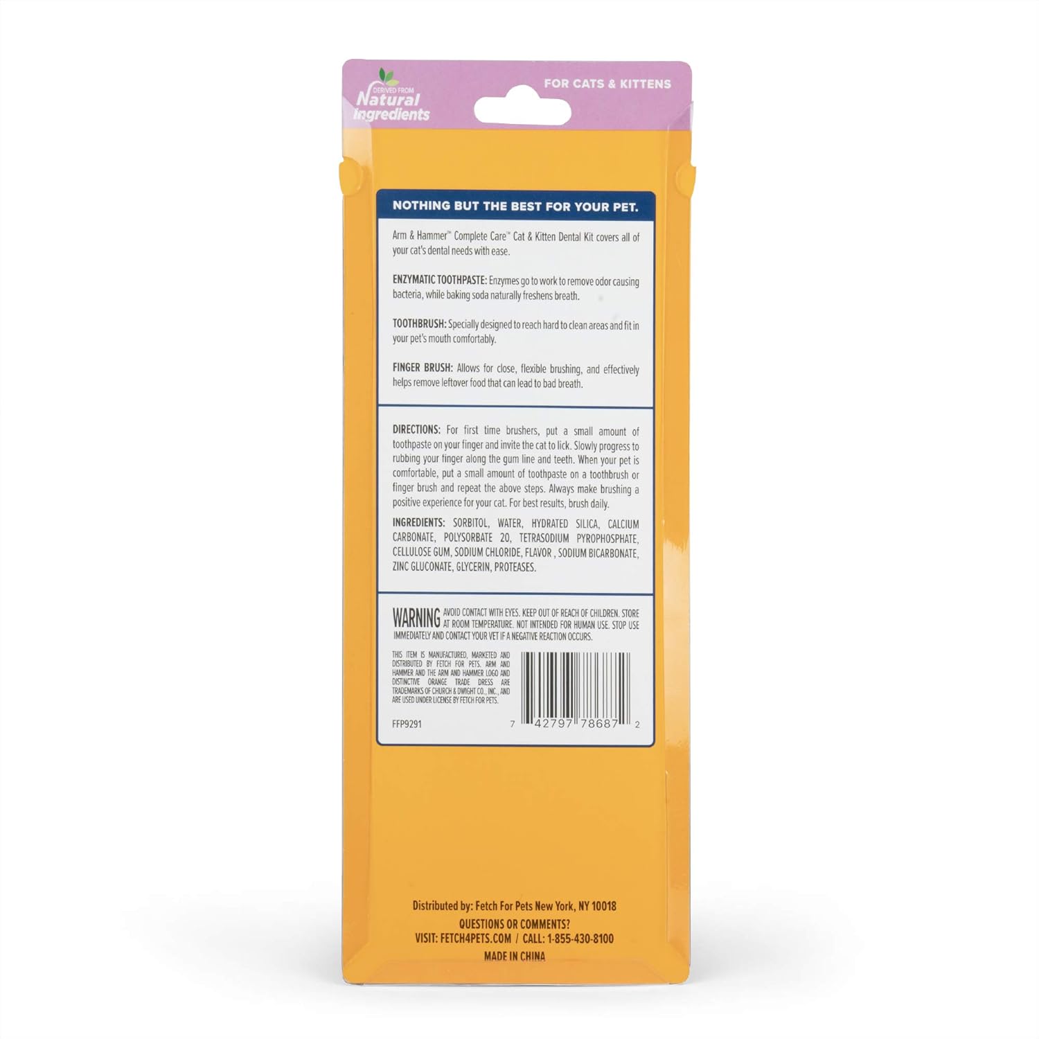 Clean your cat’s teeth and freshen your cat’s breath with the name you trust. Arm & Hammer Complete Care Cat & Kitten Dental Kit includes 2.5oz baking soda powered enzymatic cat toothpaste flavored like tuna, plus two different styles of cat toothbrush to find what works best for your pet. Arm & Hammer Advanced Care toothpaste is formulated with baking soda, which dissolves into fine particles, resulting in a deeper clean. Natural ingredients help fight tartar, clean teeth and freshen breath. The dual headed toothbrush makes it easier to reach further back in your cat’s mouth, while the cat finger brush is easy to slip over your finger and rub away plaque and tartar in a more comfortable way for your pet. For first time brushers, put a small amount of toothpaste on your finger and invite the cat to lick it off. Slowly progress to rubbing your finger along the gum line and teeth. Then put a small amount of toothpaste on the cat tooth brush and repeat. Always make this a positive experience for your pet. For best results, brush 2-3 times per week. Warnings: Avoid contact with eyes. Keep out of reach of children. Store at room temperature. Not intended for human use. In one study, veterinarians found that 40% of cats with healthy looking teeth and gums actually had dental disease showing on x-rays. Dental disease causes pain and discomfort daily, but pets are pros at hiding it. Lethargy, irritability, and cats not eating can all be symptoms of dental discomfort. Regularly brushing your cat’s teeth reduces plaque and tartar that cause dental disease and bad cat breath. Cat dental health is very important so you should always have a cat toothpaste and brush in your cat supplies and care care kit. When prepping your cat grooming supplies, don’t forget about cat dental care products that are essential for maintaining a healthy cat. Also, add cat dental water additive and cat dental treats to your cat dental health supplies for an even more powerful clean.