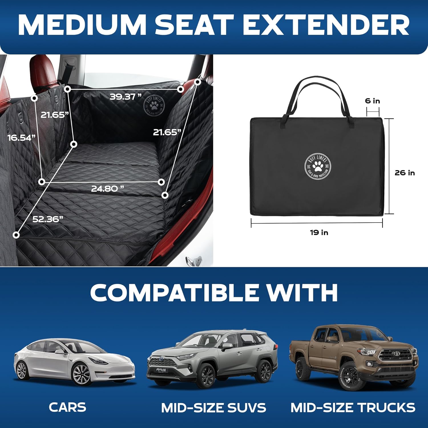 TURNS BACKSEAT INTO COMFORTABLE DOG BED – Ruff Liners backseat extender for dogs suv with soft padding on top, makes every ride more comfortable. Our back seat extender for dogs, hard bottom dog car seat cover is compatible with popular models like Tesla Models 3/Y, Toyota Tacoma, Rav4, Camry, Jeep Cherokee, Honda CRV, Ford Explorer, Lexus RX, and other similar size vehicles