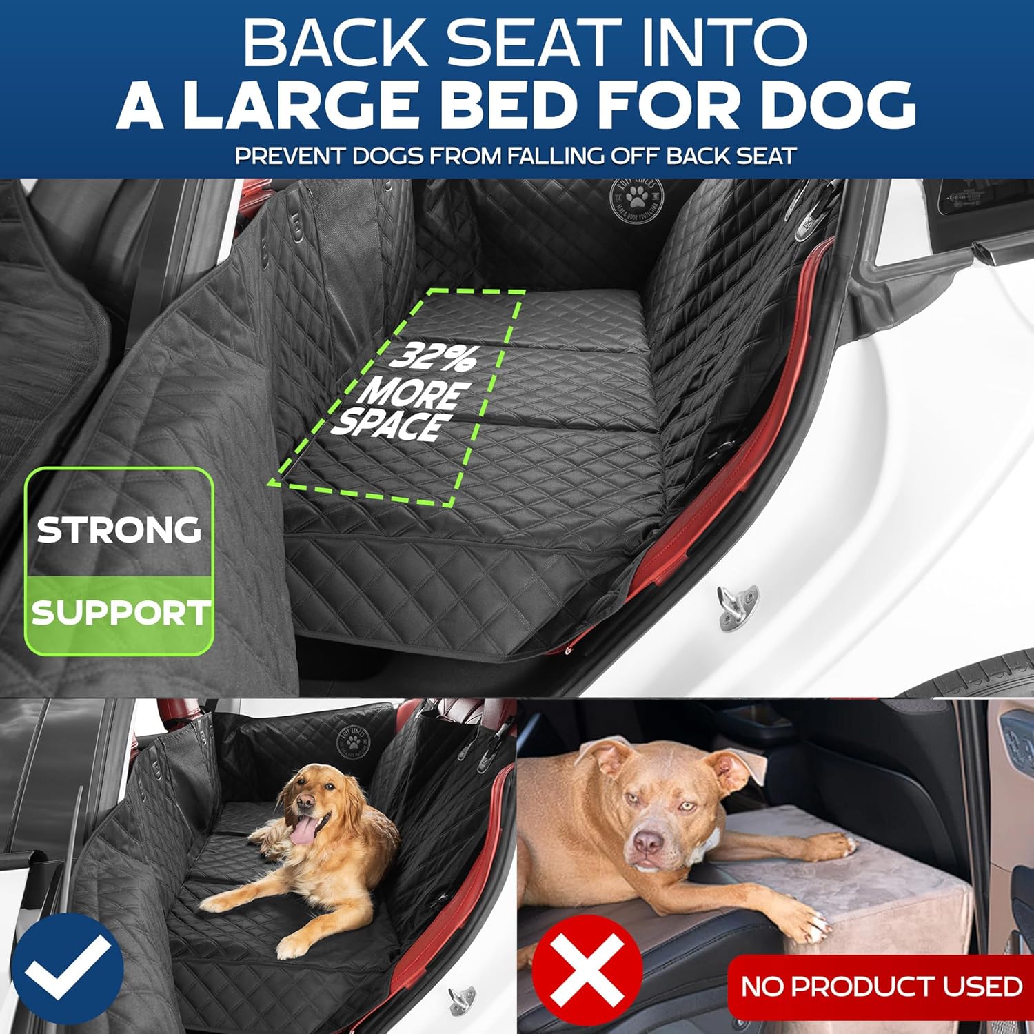HOLDS UP TO 400LBS – Our car backseat extender for dogs can support multile dogs. The Large pet back seat extender offers +32% more riding space! The dog back seat extender hard bottom has 3 removable plastic inserts that are light weight and tested to hold up to 400 lbs!