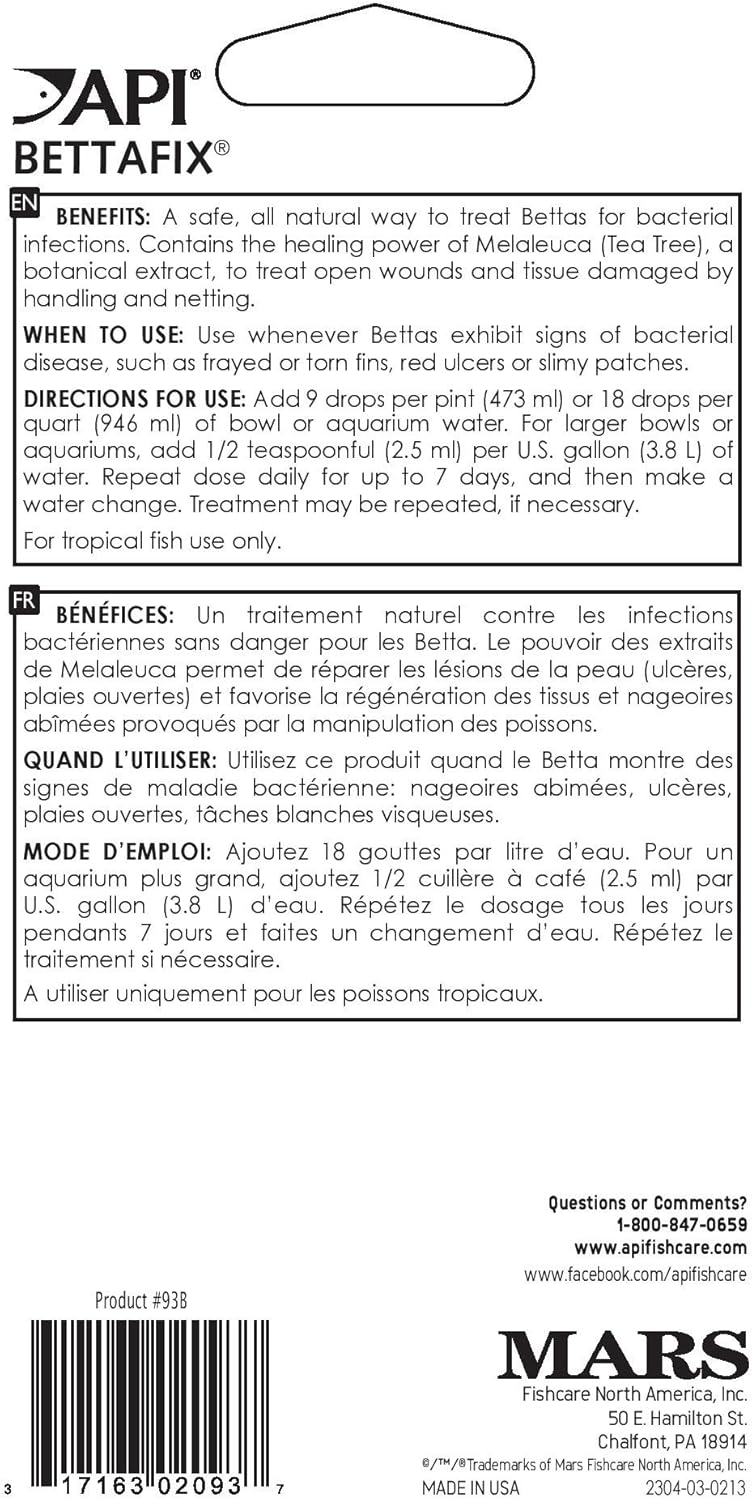 Treat and heal wounds, diseases and infections with API BETTAFIX Antibacterial & Antifungal Betta Fish Infection and Fungus Treatment. This natural antibacterial remedy promotes rapid re-growth of damaged fins and skin. Use it to treat ulcers, mouth fungus, fin and tail rot and when you see signs of bacterial and fungal diseases like red ulcers, slimy patches or cottony growths. It can also be used to help heal wounds and tissue damaged by handling, netting or fighting. Contains healing melaleuca, a variety of tea tree. API BETTAFIX Antibacterial & Antifungal Betta Fish Infection and Fungus Treatment also helps heal open wounds and tissue damaged by handling, netting and fighting, and it promotes rapid re-growth of damaged fins and skin. With API Aquarium products, it’s easy to keep a beautiful saltwater, freshwater or reef aquarium. For over 50 years, API has been creating innovative, research-driven solutions that make it easier to care for your fish and aquarium. API Aquarium Treatment Supplies are designed to work in conjunction with each other to provide best results, promote healthy bacterial growth and help control and cure fish diseases and conditions such as ich and fin rot. They work to provide a safe, hospitable environment for fish such as tropical community fish, cichlids, goldfish and more. With API, you can spend more time admiring your fish, and less time scrubbing your tank. Make sure to use all products as directed in order to ensure the best results.