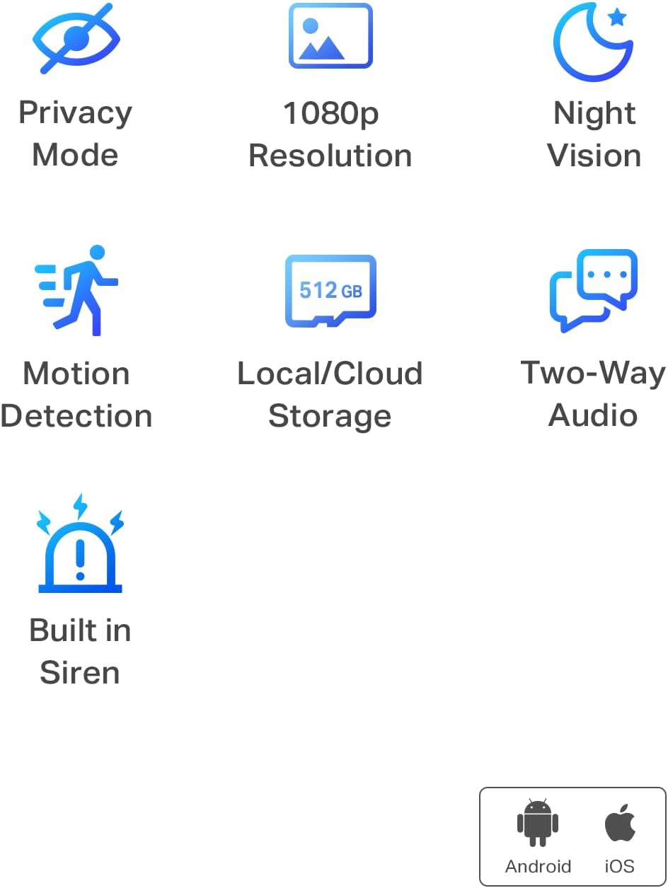 Protect your home with the Tapo C100 smart indoor security camera Wi-Fi. Featuring crystal-clear 1080P high-definition video, it captures every detail inside your home. Receive instant push notifications when motion, a person, or baby crying is detected from this baby camera monitor, all without additional fees. Monitor your home day and night with up to 30ft of night vision using the integrated IR sensor. Utilize the 2-way audio with a built-in siren to use as a pet camera with the phone app and deter intruders. Fully compatible with Amazon Alexa and Google Assistant, simply use voice commands to view the Tapo indoor security camera live stream on Echo Show or Google Chromecast with a screen. Store footage continuously on a microSD card up to 512 GB (not included) or subscribe to Tapo Care for cloud storage, offering a 30-day video history and additional benefits such as motion tracking and baby crying detection. [Before purchasing a microSD card, please check the TP-Link website FAQ to ensure compatibility with your device.]